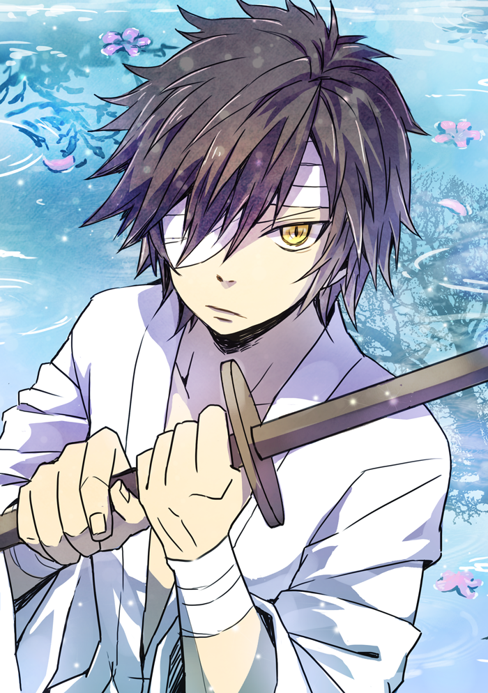1boy aged_down bandage_over_one_eye bandaged_wrist bandages bokken brown_hair date_masamune_(sengoku_basara) frown ha0810 holding holding_sword holding_weapon looking_at_viewer male_focus portrait ripples sengoku_basara short_hair slit_pupils solo sword v-shaped_eyebrows weapon wooden_sword yellow_eyes