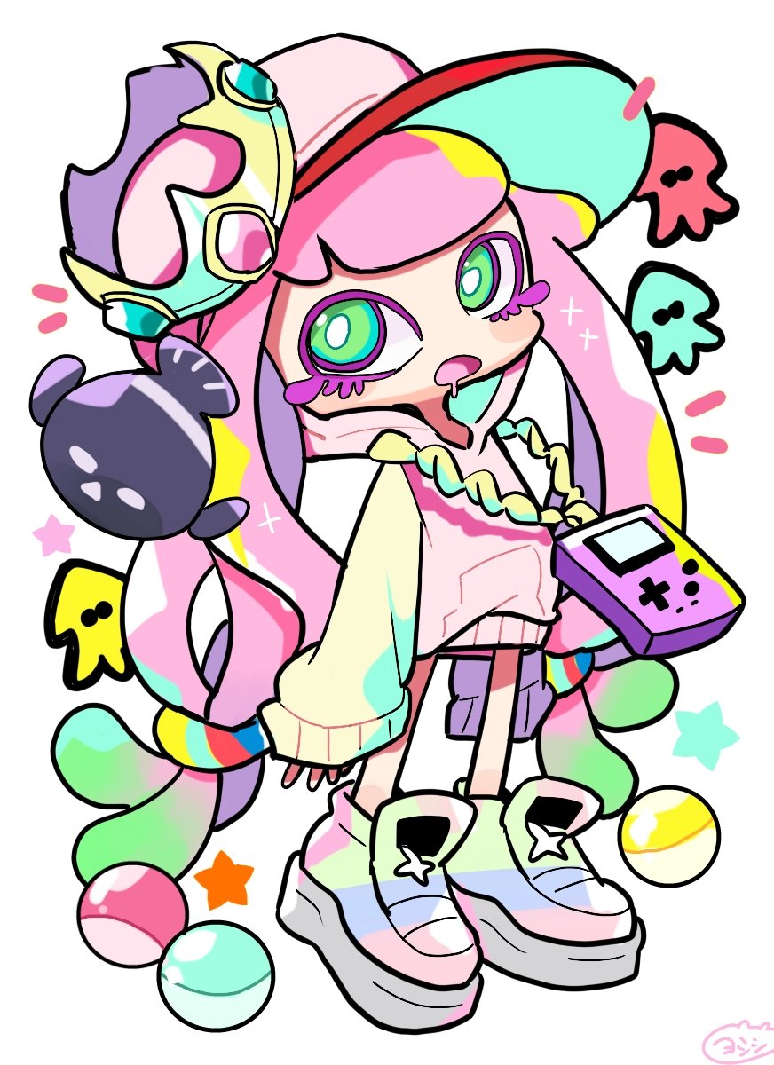1girl animal baseball_cap blush clownfish cosplay crown drooling fish game_boy game_boy_(original) gashapon green_eyes handheld_game_console harmony's_clownfish_(splatoon) harmony_(splatoon) hat highres hood hood_up hoodie jewelry long_hair long_sleeves looking_at_viewer looking_to_the_side multicolored_footwear necklace nintendo open_mouth orb pearl_(splatoon) pearl_(splatoon)_(cosplay) pink_hair pink_hat pink_hoodie sea_anemone shoes sneakers sparkle splatoon_(series) squid standing star_(symbol) white_background yoshishi_(yosisitoho)