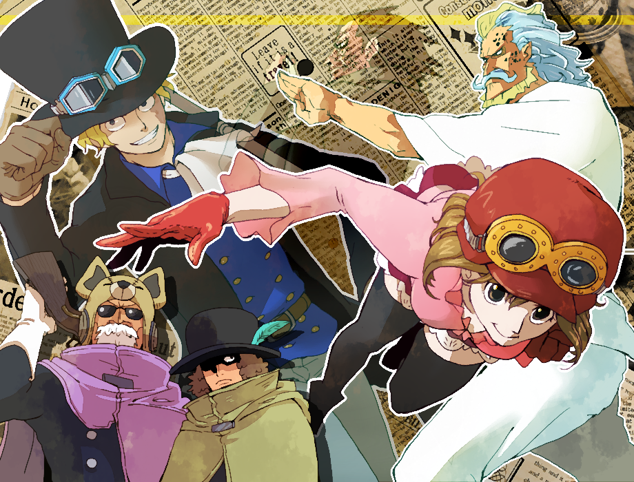 1girl 5boys ascot beard black_thighhighs blonde_hair blue_feathers blue_hair brown_gloves brown_hair bunny_joe cloak closed_mouth commentary_request curly_hair facial_hair feathers fish_boy gloves goggles goggles_on_headwear green_cloak hack_(one_piece) hair_slicked_back hat hat_feather koala_(one_piece) looking_at_viewer monkey_d._dragon multiple_boys mustache one_piece pink_shirt profile purple_cloak sabo_(one_piece) scar scar_on_face shirt short_hair skirt smile sunglasses tanaka_(tanakya123) thighhighs top_hat white_ascot
