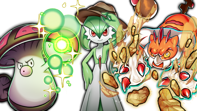 amoonguss bob_cut brown_hat claws colored_skin gardevoir gen_3_pokemon gen_5_pokemon green_hair hand_on_headwear hand_on_own_hip hat landorus landorus_(therian) legendary_pokemon looking_at_viewer lotosu multicolored_skin nintendo orange_skin pink_eyes poke_ball_symbol pokemon pokemon_(creature) rock second-party_source simple_background smile sparkle two-tone_skin white_background white_skin yellow_eyes