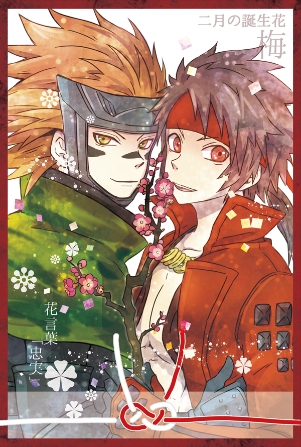 2boys :d black_gloves branch brown_eyes brown_hair capelet face-to-face flower gloves green_capelet ha0810 headband holding holding_branch jacket jewelry long_hair looking_at_viewer low_ponytail male_focus multiple_boys necklace ninja no_shirt open_mouth ponytail red_eyes red_headband red_jacket sanada_yukimura_(sengoku_basara) sarutobi_sasuke_(sengoku_basara) sengoku_basara smile upper_body