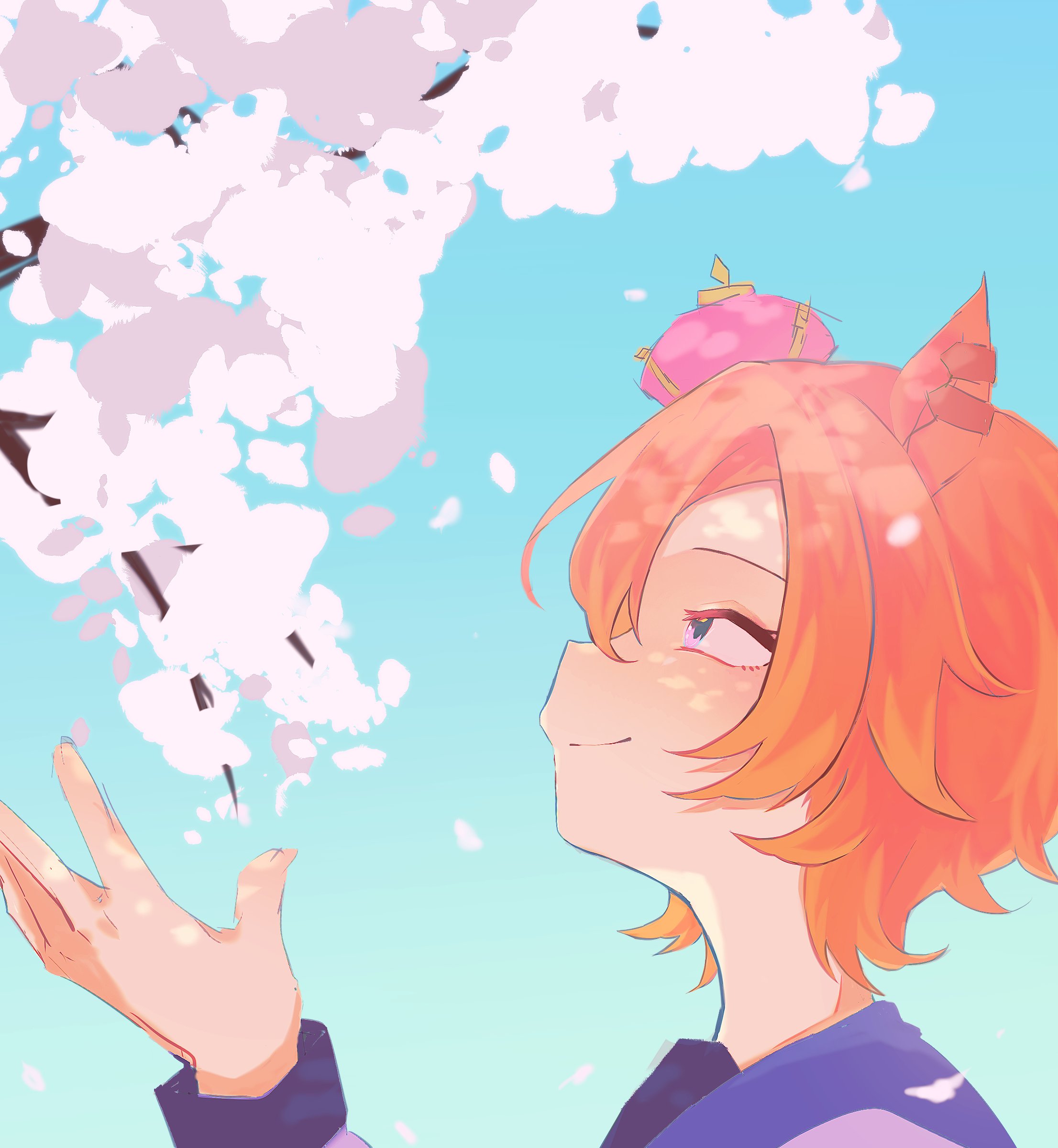 1girl absurdres animal_ears cherry_blossoms closed_mouth crown from_side hand_up highres horse_ears long_sleeves mihanada_mui mini_crown orange_hair outdoors profile purple_eyes purple_shirt shirt short_hair sideways_mouth smile solo t.m._opera_o_(umamusume) tree umamusume upper_body