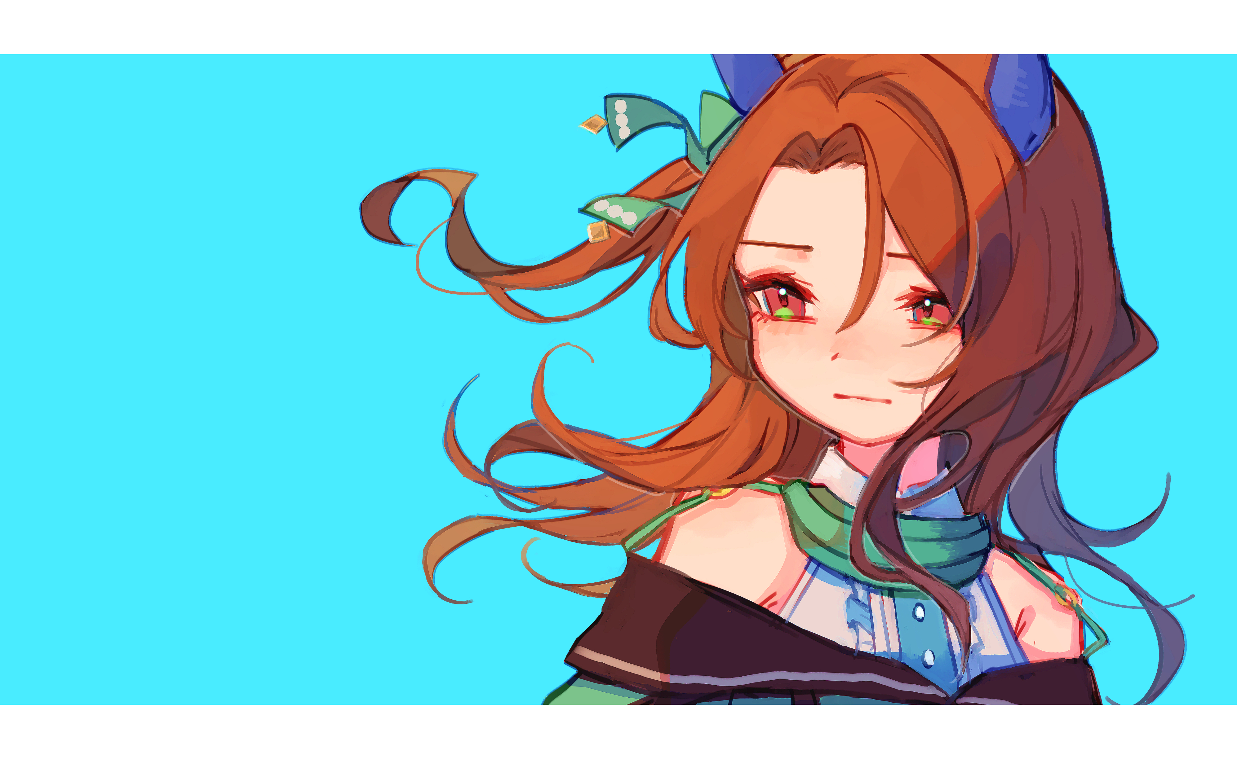 1girl absurdres animal_ears aqua_background bare_shoulders brown_hair center_frills closed_mouth coat ear_covers floating_hair frills highres horse_ears king_halo_(umamusume) long_hair looking_to_the_side mihanada_mui off-shoulder_coat off_shoulder one_side_up parted_bangs portrait red_eyes shirt simple_background sleeveless sleeveless_shirt solo umamusume white_shirt