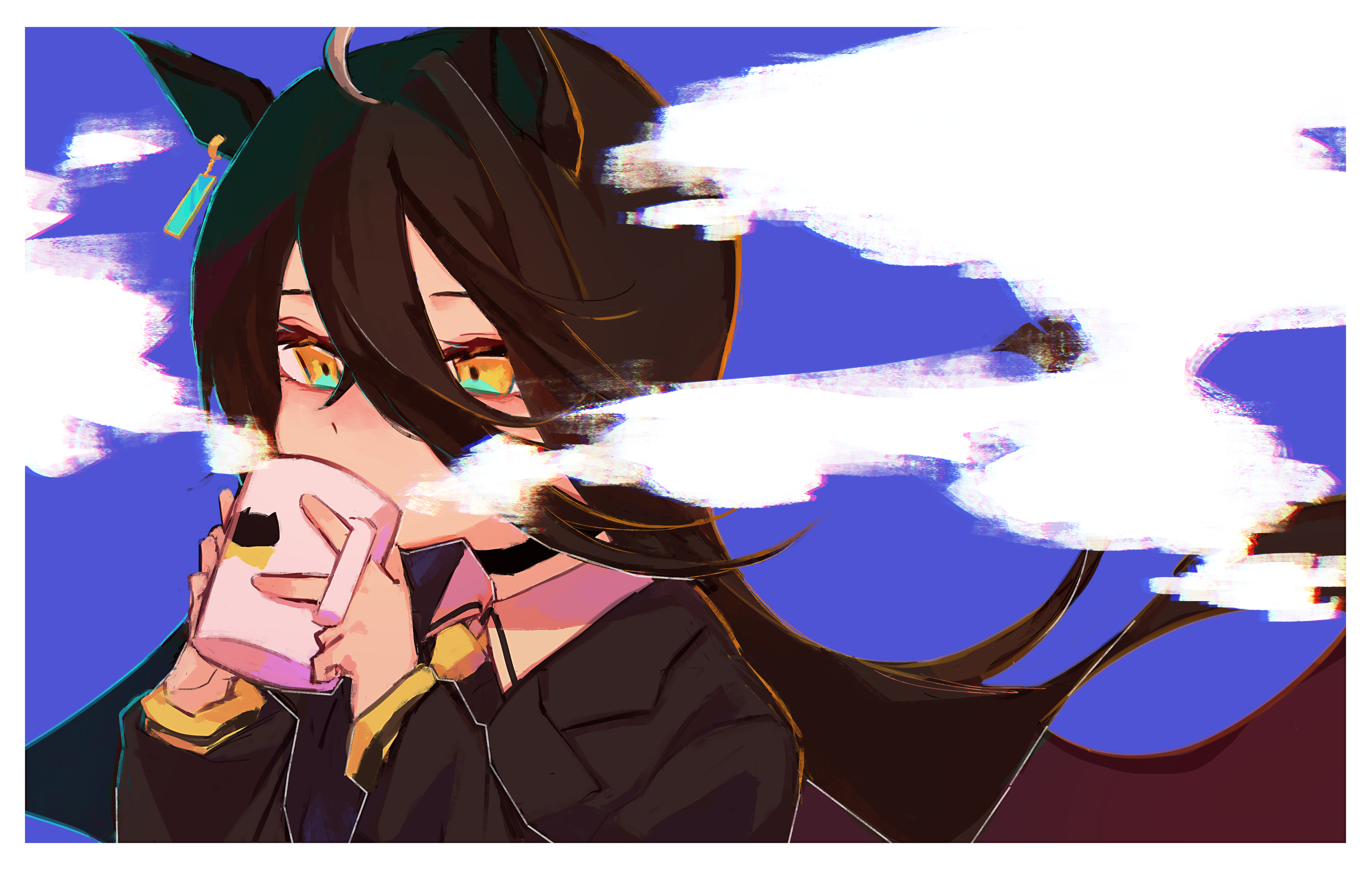 1girl absurdres ahoge animal_ears black_hair black_jacket blue_background choker collared_shirt cup drinking earrings hair_between_eyes highres holding holding_cup horse_ears jacket jewelry long_hair long_sleeves manhattan_cafe_(umamusume) mihanada_mui mug shirt single_earring solo steam umamusume upper_body yellow_eyes