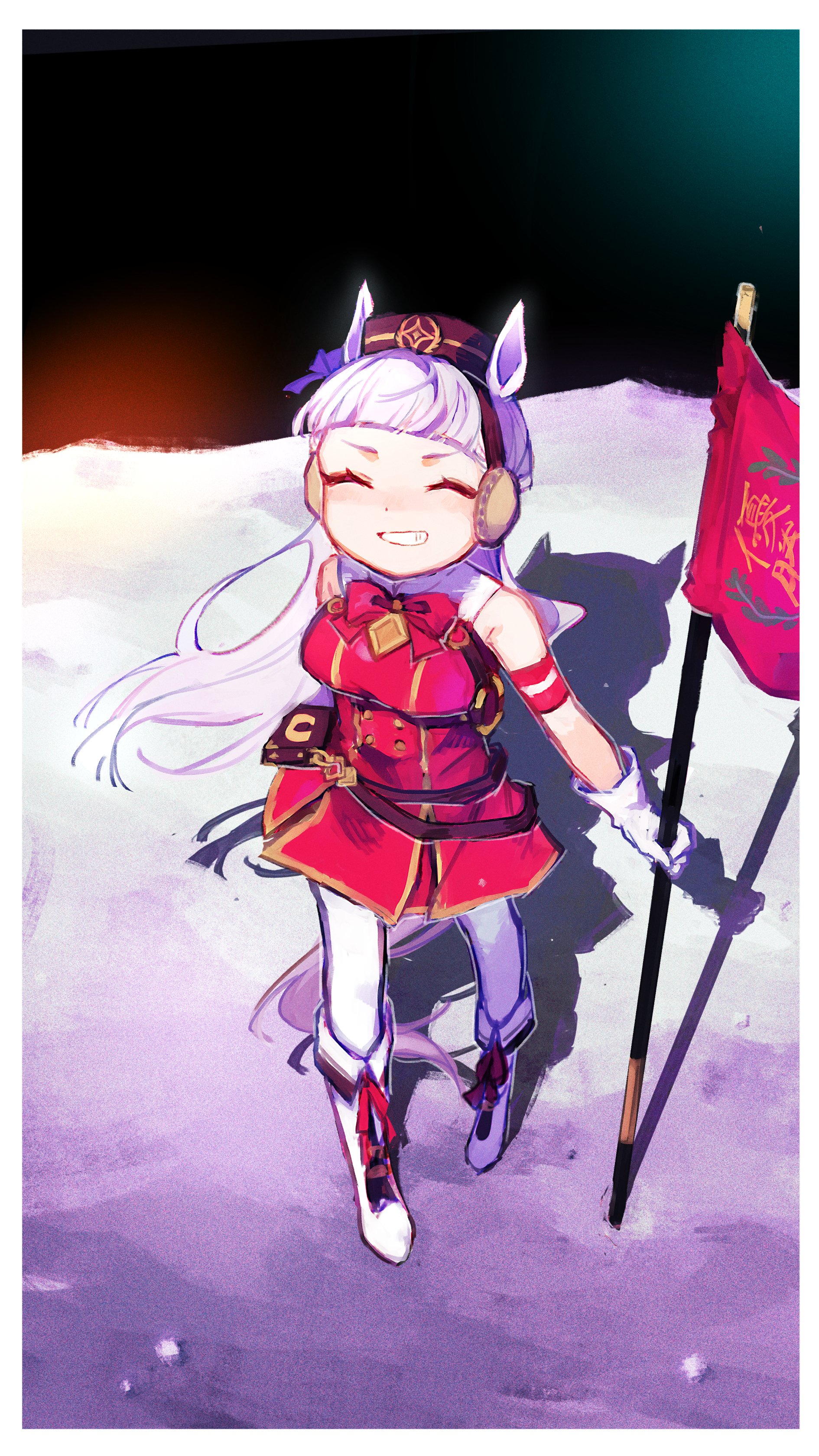 1girl ^_^ absurdres animal_ears armband belt boots bow bowtie breasts brown_hat brown_pants closed_eyes dress facing_viewer flag full_body gloves gold_ship_(red_strife)_(umamusume) gold_ship_(umamusume) grin hat highres horse_ears horse_girl horse_tail long_hair mihanada_mui moon pants red_dress shadow sleeveless sleeveless_dress small_breasts smile solo space standing tail umamusume white_boots white_gloves white_hair