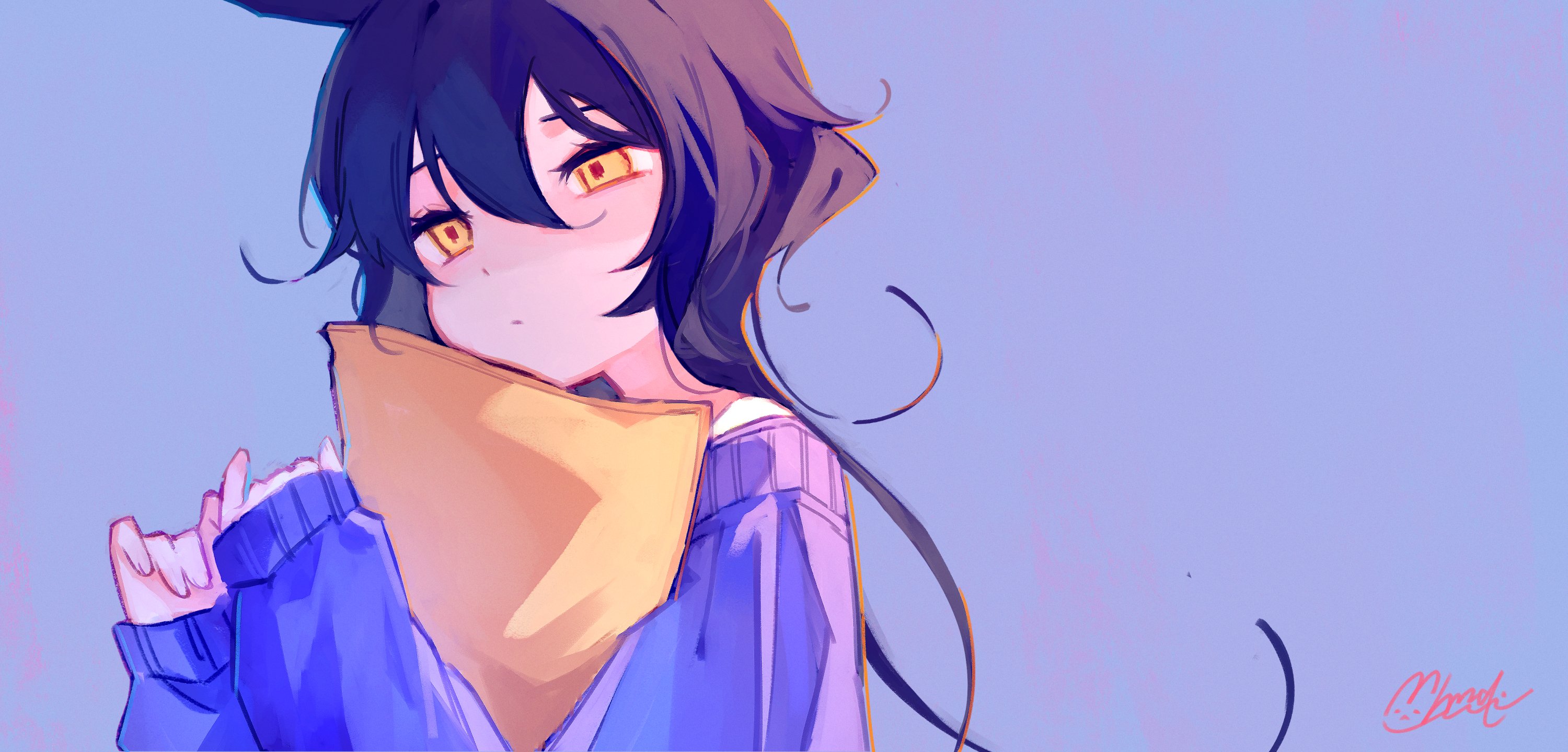 1girl animal_ears closed_mouth hair_between_eyes highres long_hair long_sleeves mihanada_mui off_shoulder original purple_shirt shirt sleeves_past_wrists solo twitter_username upper_body watermark yellow_eyes