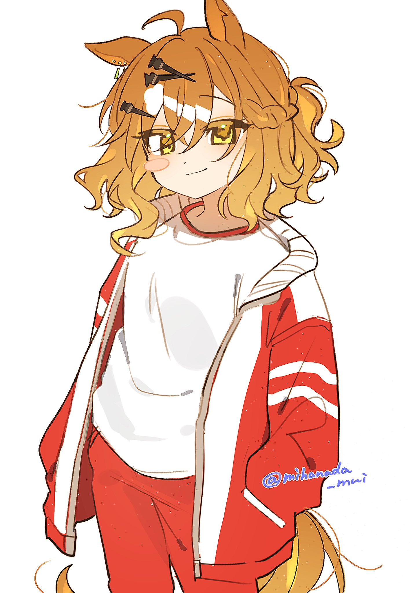 1girl ahoge animal_ears blush_stickers brown_hair closed_mouth cowboy_shot hair_between_eyes hair_ornament hairclip hands_in_pockets highres horse_ears horse_girl horse_tail jacket jungle_pocket_(umamusume) long_sleeves medium_hair mihanada_mui notched_ear open_clothes open_jacket pants red_jacket red_pants shirt simple_background smile solo standing tail track_jacket twitter_username umamusume white_background white_shirt yellow_eyes