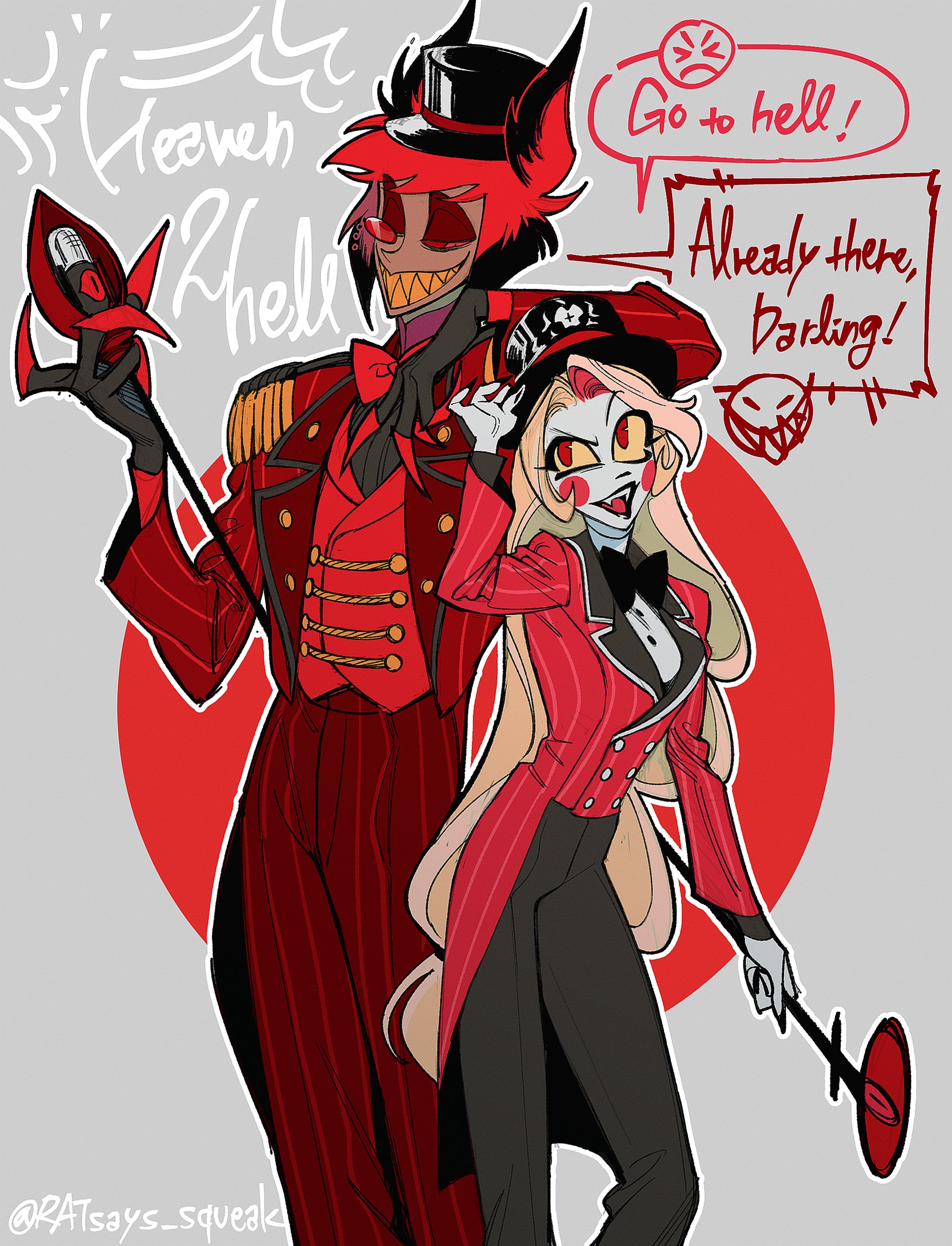 1boy 1girl absurdres alastor_(hazbin_hotel) blonde_hair blush_stickers cane charlie_morningstar demon_boy demon_girl english_text hazbin_hotel hellaverse highres holding holding_cane pale_skin ratsays_squeak red_eyes sharp_teeth teeth