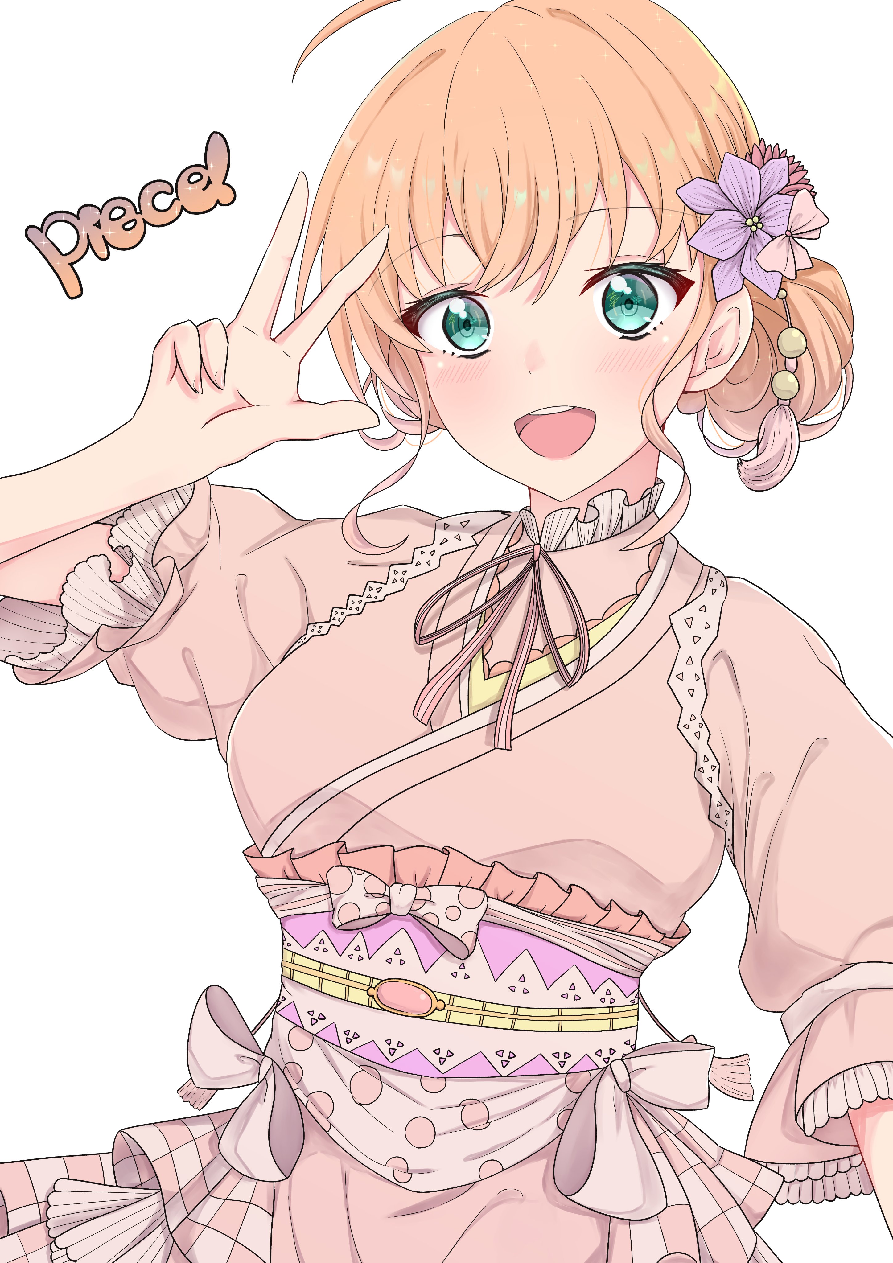 1girl absurdres blush collar commentary_request english_text flower frilled_collar frilled_sleeves frills green_eyes hair_flower hair_ornament hand_up highres hinoshita_kaho ikuto_(nanami_ice) japanese_clothes kimono link!_like!_love_live! looking_at_viewer love_live! neck_ribbon obi official_alternate_hairstyle open_mouth orange_hair pink_kimono pink_ribbon ribbon sash short_sleeves solo sugao_no_pixel upper_body virtual_youtuber w white_background