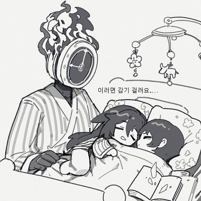 1other 2boys blanket blush book clock closed_eyes closed_mouth coat dante_(limbus_company) e.g.o_(project_moon) fire flaw_eight greyscale happy hong_lu_(project_moon) land_of_illusion_(e.g.o) limbus_company long_sleeves monochrome multiple_boys object_head open_mouth pajamas pillow project_moon simple_background sleeping smile yi_sang_(project_moon)