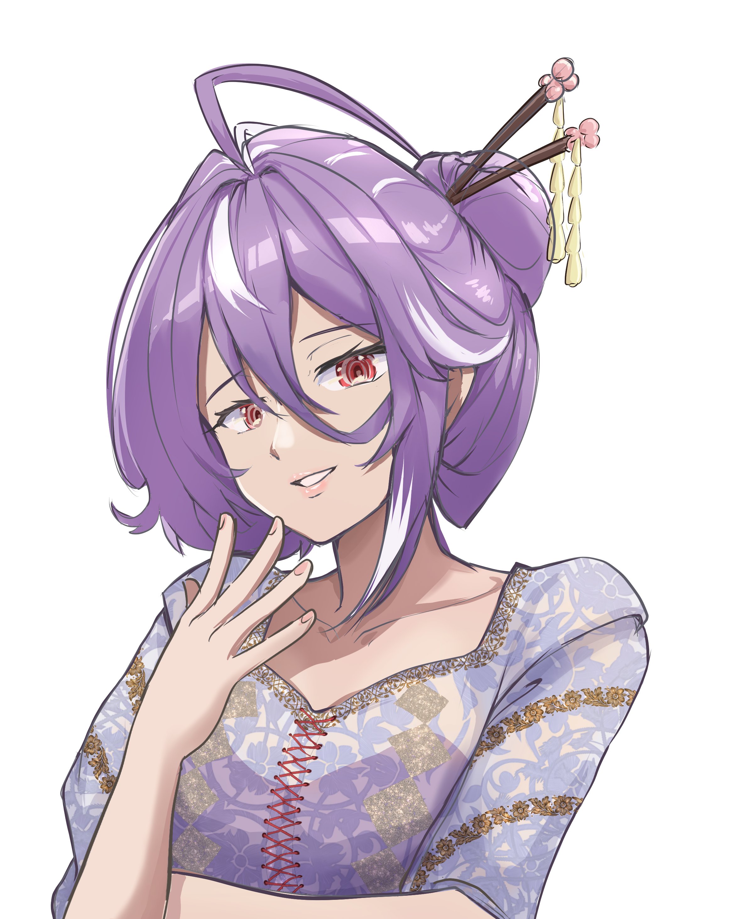 1girl absurdres ahoge collarbone cross-laced_clothes cross-laced_dress dress eyelashes floral_print hair_between_eyes hair_bun hair_ornament hair_stick hand_up highres katosh michimom_(michi_mochievee) multicolored_dress multicolored_hair parted_lips purple_dress purple_hair red_eyes short_hair solo streaked_hair upper_body virtual_youtuber vshojo white_hair