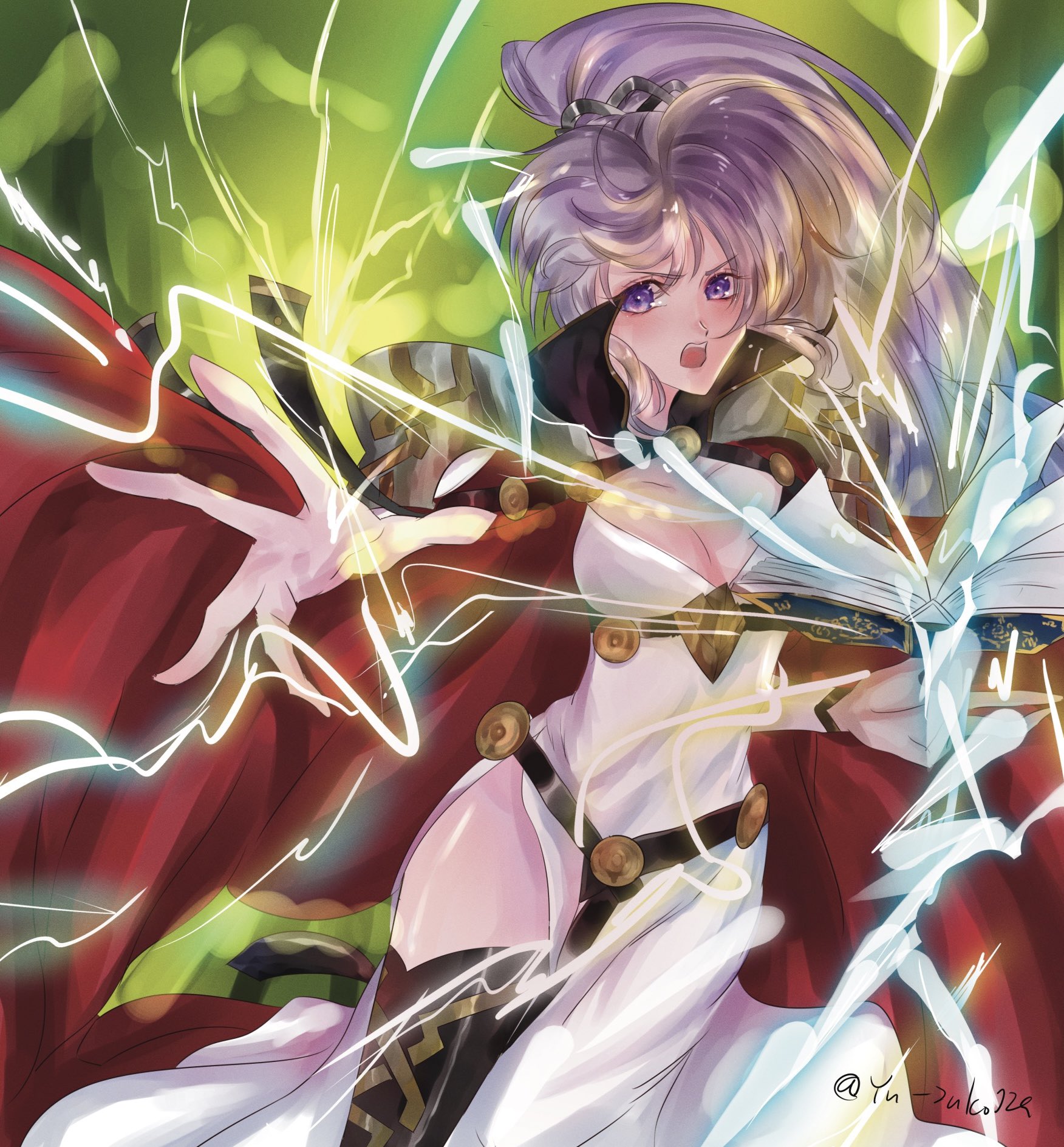 1girl artist_name book cape fire_emblem fire_emblem:_genealogy_of_the_holy_war fire_emblem_heroes hair_ornament highres holding holding_book ishtar_(fire_emblem) ishtar_(resplendent)_(fire_emblem) lightning magic nintendo official_alternate_costume purple_eyes purple_hair yuruzuko