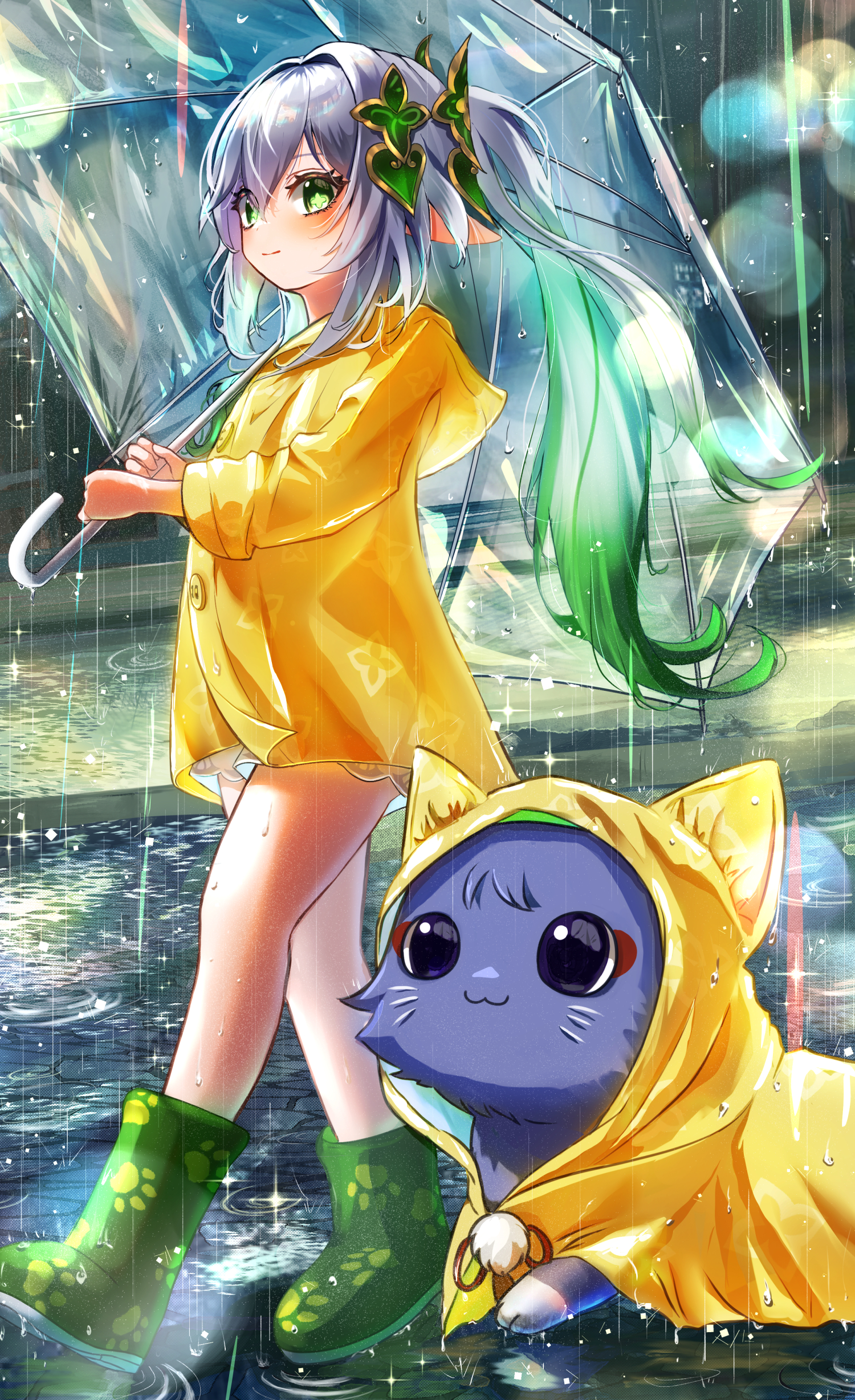 1girl :3 absurdres bloomers boots commentary_request full_body genshin_impact gradient_hair green_eyes green_footwear green_hair hair_between_eyes han_(riyonosyumi) highres holding holding_umbrella looking_at_another multicolored_hair nahida_(genshin_impact) outdoors pointy_ears rain raincoat ripples rubber_boots scaramouche_(cat)_(genshin_impact) scaramouche_(genshin_impact) side_ponytail smile star-shaped_pupils star_(symbol) symbol-shaped_pupils transparent transparent_umbrella umbrella underwear walking white_bloomers white_hair yellow_raincoat