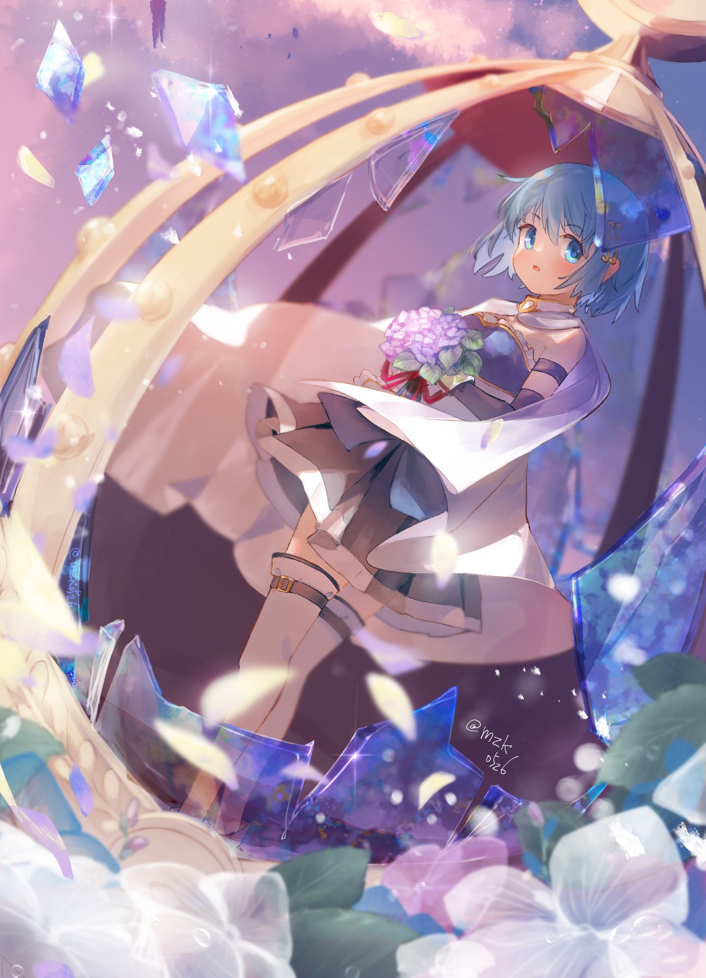 blue_eyes blue_hair broken broken_glass cage cape detached_sleeves flower fortissimo glass hair_ornament highres hydrangea in_cage magical_girl mahou_shoujo_madoka_magica mahou_shoujo_madoka_magica_(anime) miki_sayaka miki_sayaka_(magical_girl) musical_note musical_note_hair_ornament mzk0526 soul_gem tagme thighhighs white_cape white_thighhighs