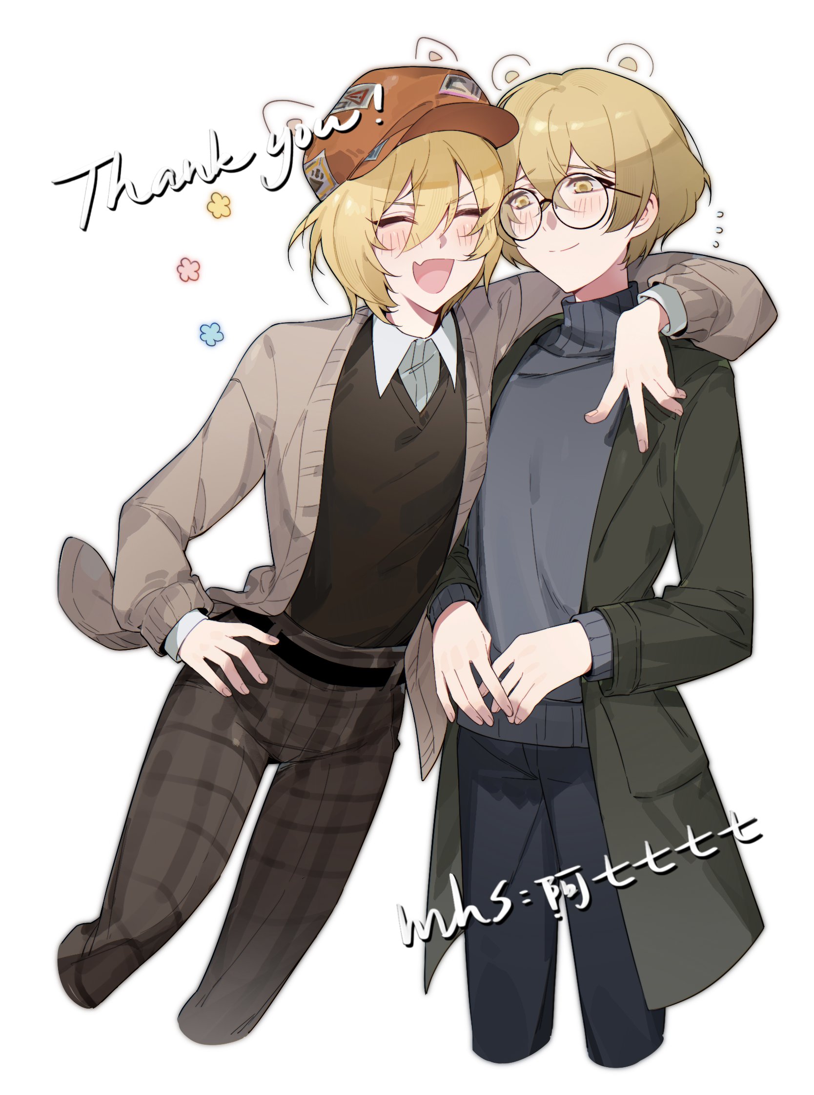 1boy 1girl aqiqiqiqi blue_pants blue_sweater blush brown_pants brown_sweater_vest closed_eyes coat don_quixote_(project_moon) glasses green_coat highres limbus_company long_sleeves open_mouth pants plaid_clothes plaid_pants project_moon round_eyewear simple_background sinclair_(project_moon) smile sweater sweater_vest white_background zwei_association_(identity)_(project_moon) zwei_association_south_uniform