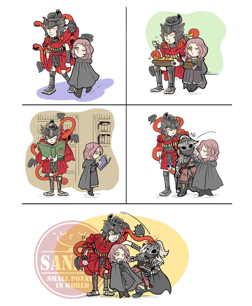1boy 1girl 1other adjusting_hood angry armor black_cloak bloody_wolf_(elden_ring) brother_and_sister brown_cloak cape chibi cloak elden_ring elden_ring:_shadow_of_the_erdtree facial_tattoo food hood hood_down hooded_cape hooded_cloak melina_(elden_ring) messmer_the_impaler one-eyed red_hair siblings snake tarnished_(elden_ring) tattoo zeanas214