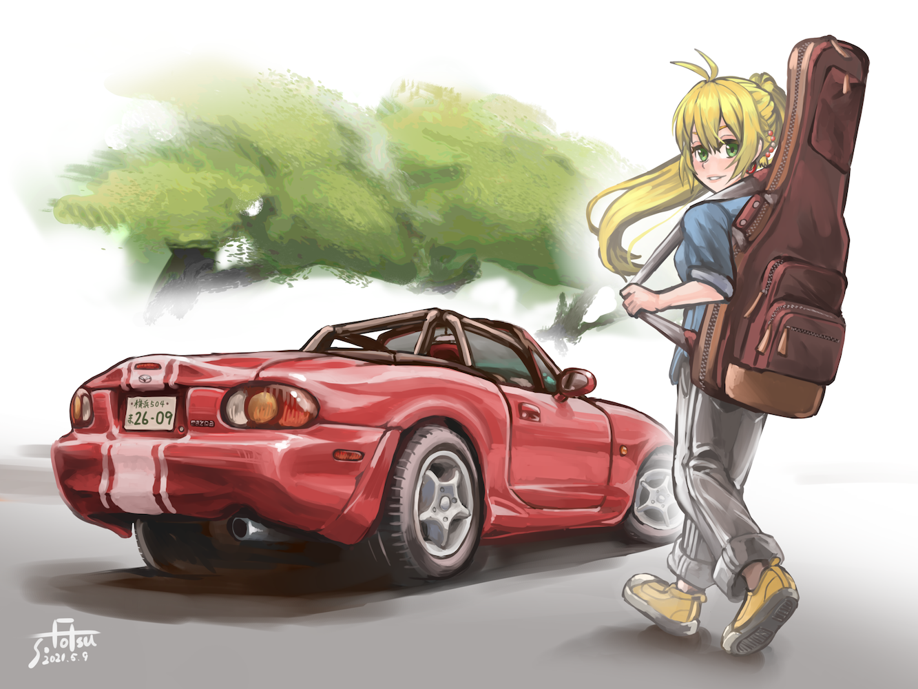 1girl artist_logo blonde_hair blue_jacket breasts car convertible cowlick eunos_roadster floating_hair green_eyes grey_pants guitar_casee hair_between_eyes jacket logo looking_at_viewer looking_back mazda mazda_mx-5 mazda_mx-5_nb motor_vehicle pants parted_lips ponytail shadow shoes small_breasts smile sneakers solo totsu_shoujirou tree tsurumaki_maki vehicle_focus voiceroid walking yellow_shoes