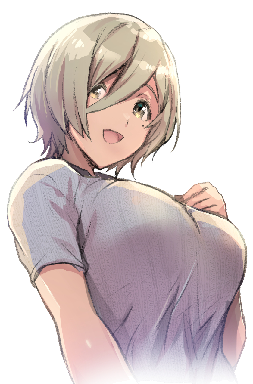 1girl breasts brown_eyes brown_hair commentary_request girls_band_cry grey_shirt hair_between_eyes highres kashi large_breasts long_hair_between_eyes mole mole_under_eye open_mouth rupa_(girls_band_cry) shirt short_hair short_sleeves simple_background solo upper_body white_background