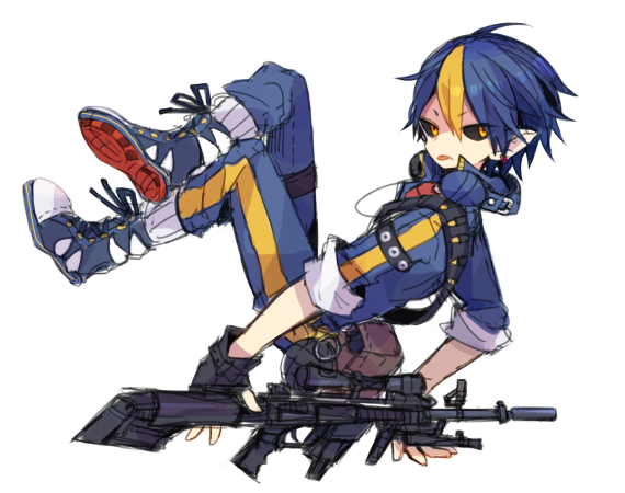 1boy ammunition_belt ao_(blue_bunny) black_gloves black_sclera blue_pants colored_sclera fingerless_gloves floating full_body garchomp gen_4_pokemon gloves gun holding holding_gun holding_weapon looking_at_viewer male_focus multicolored_hair nintendo orange_eyes pants personification pokemon shoes short_hair sneakers solo streaked_hair tongue tongue_out weapon white_background