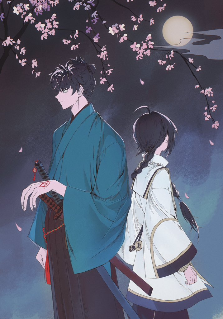 1boy 1other ahoge androgynous black_hair black_hakama blue_kimono bracelet braid cherry_blossoms command_spell falling_petals fate/samurai_remnant fate_(series) from_behind hair_intakes hakama japanese_clothes jewelry katana kimono long_sleeves miyamoto_iori_(fate) moon natsukiki necklace night petals profile sheath sheathed sidelocks single_braid sword sword_on_back topknot weapon weapon_on_back yamato_takeru_(fate)