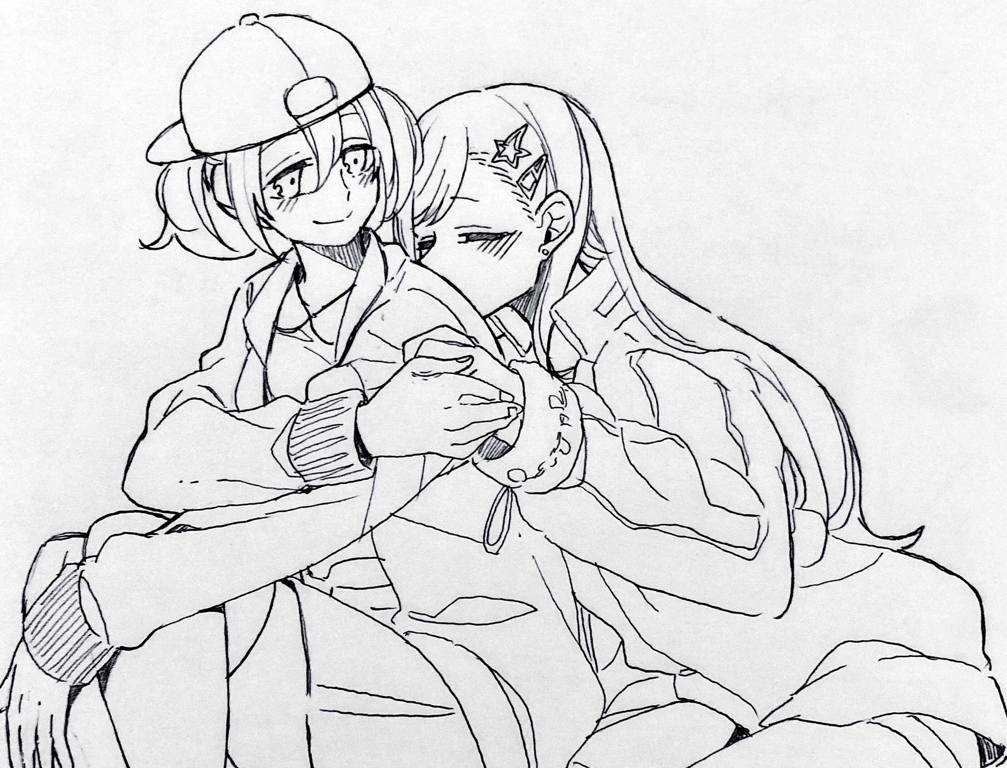 2girls azusawa_kohane baseball_cap blush closed_eyes closed_mouth commentary_request earrings greyscale hair_ornament hat highres holding_hands jacket jewelry monochrome multiple_girls mygod55555 project_sekai shiraishi_an sitting smile star_(symbol) star_hair_ornament stud_earrings yuri