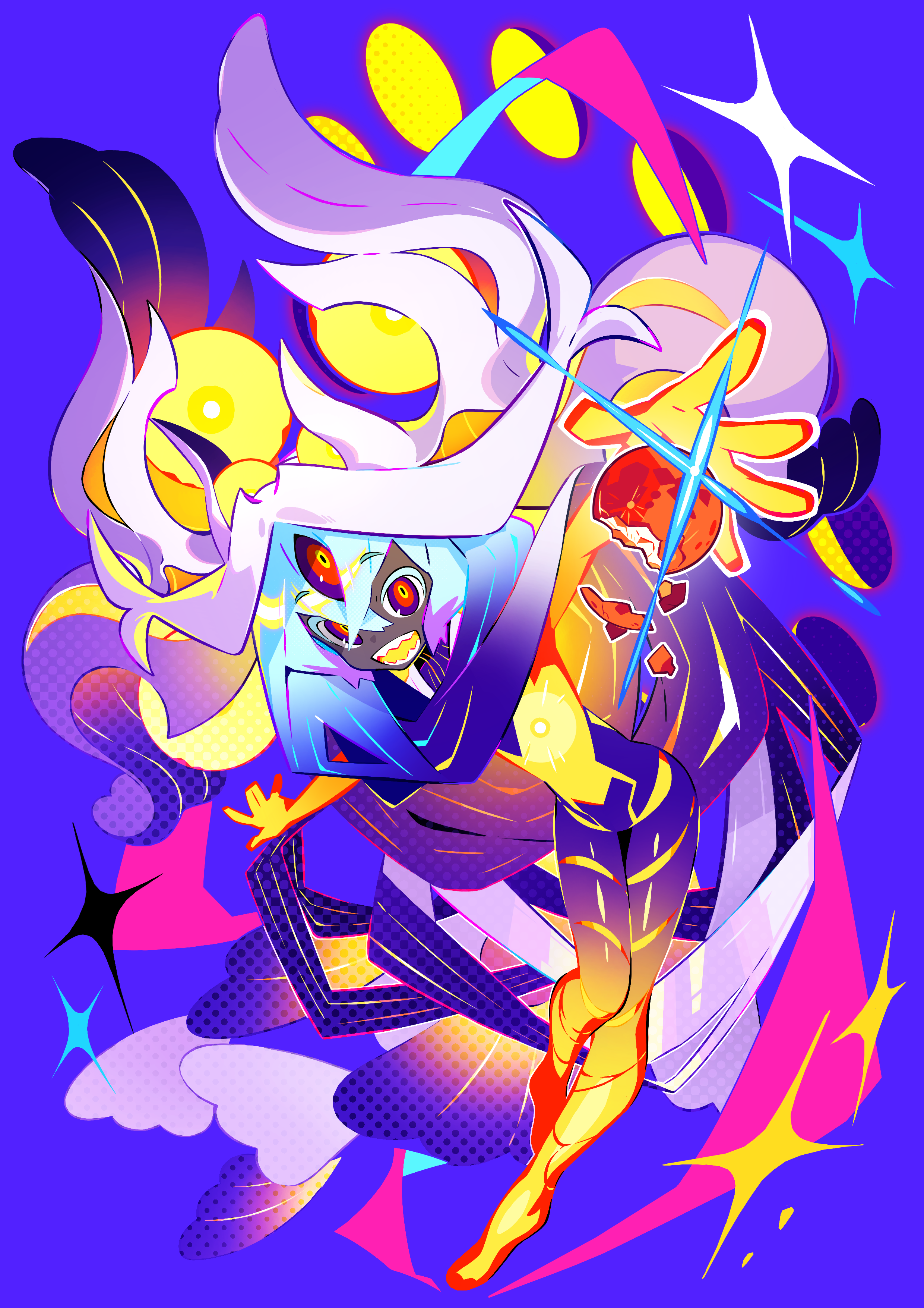 1boy absurdres blue_hair cloak colored_eyelashes colored_tongue core diffraction_spikes extra_eyes full_body highres looking_at_viewer monster_boy multicolored_eyes neon_palette open_mouth original outstretched_arms purple_background purple_eyes red_eyes saadiya74 sharp_teeth solo teeth third_eye trap yellow_eyes yellow_tongue