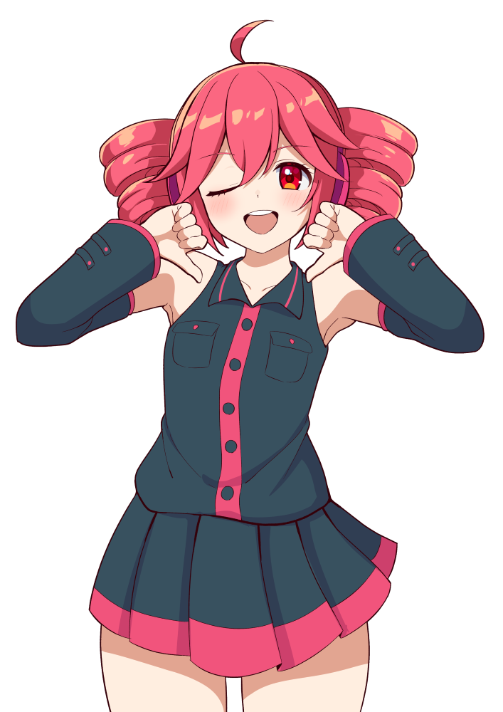 1girl ahoge black_skirt black_sleeves blush detached_sleeves drill_hair kasane_teto kasane_teto_(utau) long_hair looking_at_viewer one_eye_closed open_mouth red_eyes red_hair shirt skirt sleeveless solo thumbs_down torinokawori twin_drills twintails utau white_background