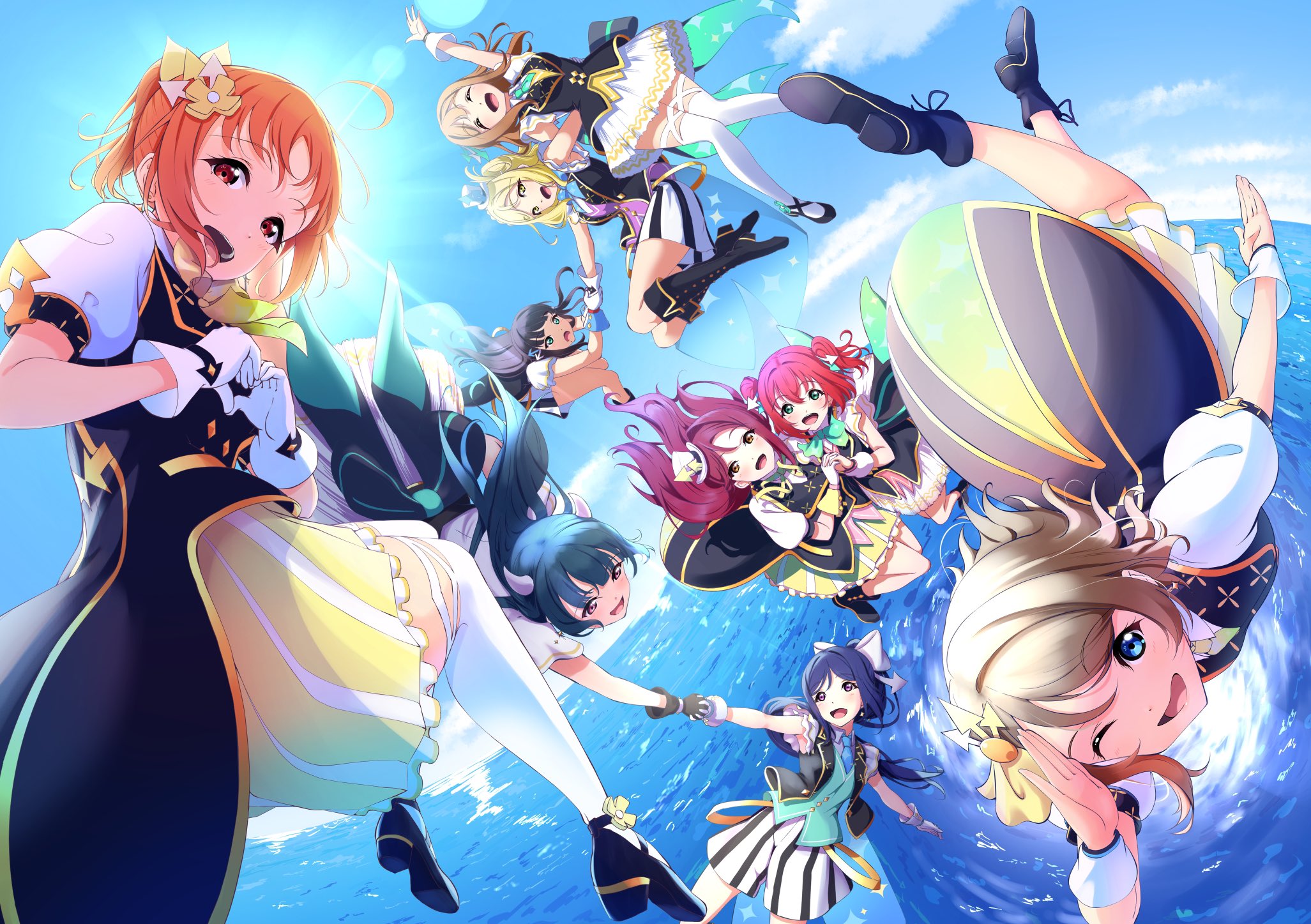 amaki-chan_(volfuji) blush cloud high_heels highres horns idol kunikida_hanamaru kurosawa_dia kurosawa_ruby love_live! love_live!_sunshine!! matsuura_kanan ocean ohara_mari open_mouth sakurauchi_riko skirt sky smile takami_chika thighs tsushima_yoshiko watanabe_you water