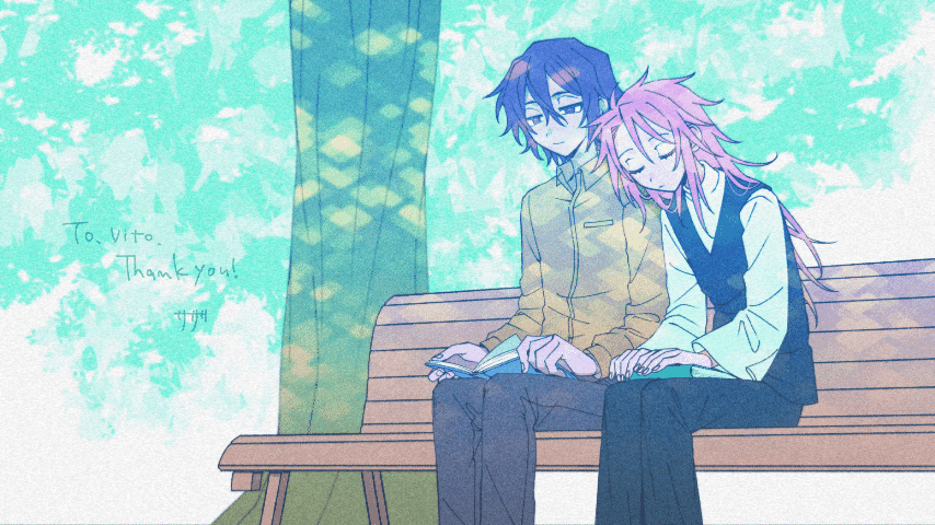 2boys animated animated_gif bench black_pants black_vest blinking blue_eyes blue_hair book book_on_lap brown_shirt closed_eyes closed_mouth collared_shirt hatsutori_hajime head_on_another's_shoulder holding holding_book long_hair long_sleeves male_focus multiple_boys on_bench open_book outdoors pants park_bench pink_hair safe3133 saibou_shinkyoku second-party_source shirt sitting smile tree utsugi_noriyuki vest white_shirt