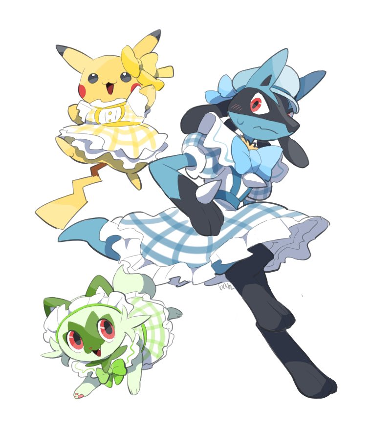ban_(ban62460424) blush bow closed_mouth clothed_pokemon dress full_body gen_1_pokemon gen_4_pokemon gen_6_pokemon grey_eyes lucario multicolored_fur nintendo open_mouth pikachu pink_eyes pokemon pokemon_(creature) red_eyes simple_background smile spikes sprigatito sweat sylveon sylveon_(checkered) two-tone_dress white_background
