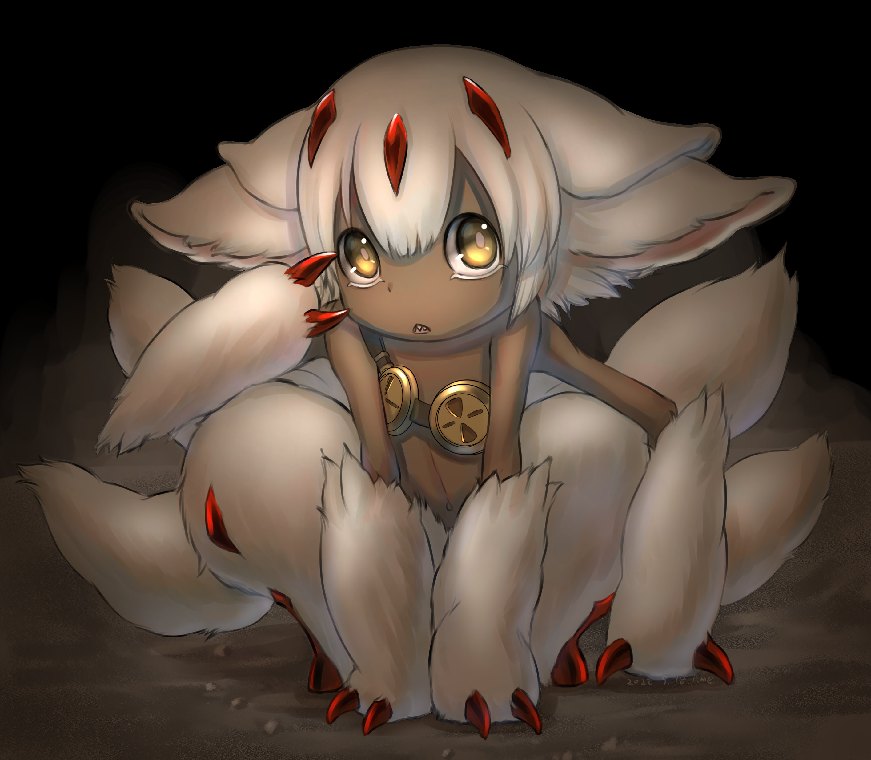 1girl 2022 absurdres artist_name black_skin cactus41747280 claws colored_skin dated extra_arms faputa full_body hair_between_eyes highres made_in_abyss navel open_mouth red_claws sharp_teeth short_hair solo squatting teeth triangle_mouth white_hair yellow_eyes