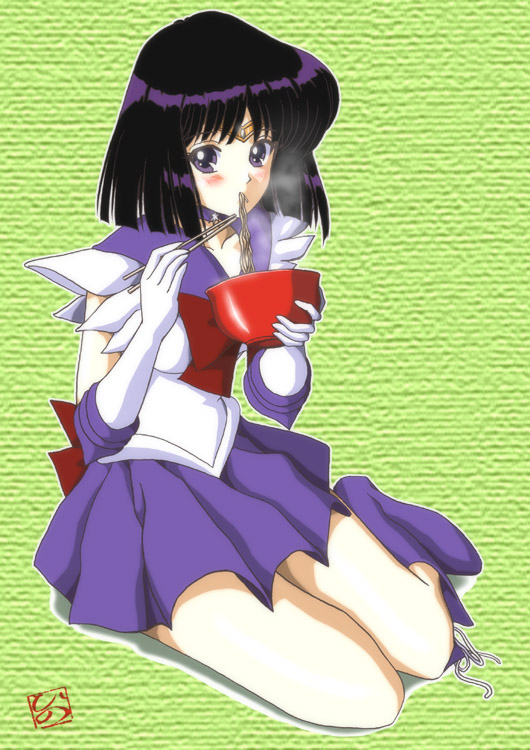 1990s_(style) bishoujo_senshi_sailor_moon bob_cut chopsticks eating female_focus food hino_ryutaro looking_at_viewer magical_girl noodles ramen retro_artstyle sailor_saturn sailor_senshi_uniform sitting steam tomoe_hotaru