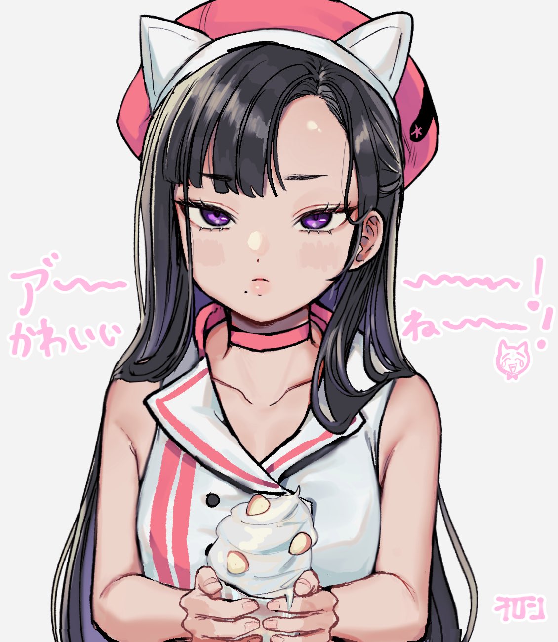 1girl animal_ears asymmetrical_bangs beret black_hair blush breasts choker collarbone colored_inner_hair eunhwa_(nikke) fake_animal_ears forehead goddess_of_victory:_nikke hat highres holding lips long_hair looking_at_viewer multicolored_hair pink_choker purple_eyes purple_hair shirt sideless_shirt small_breasts solo white_shirt woro_4