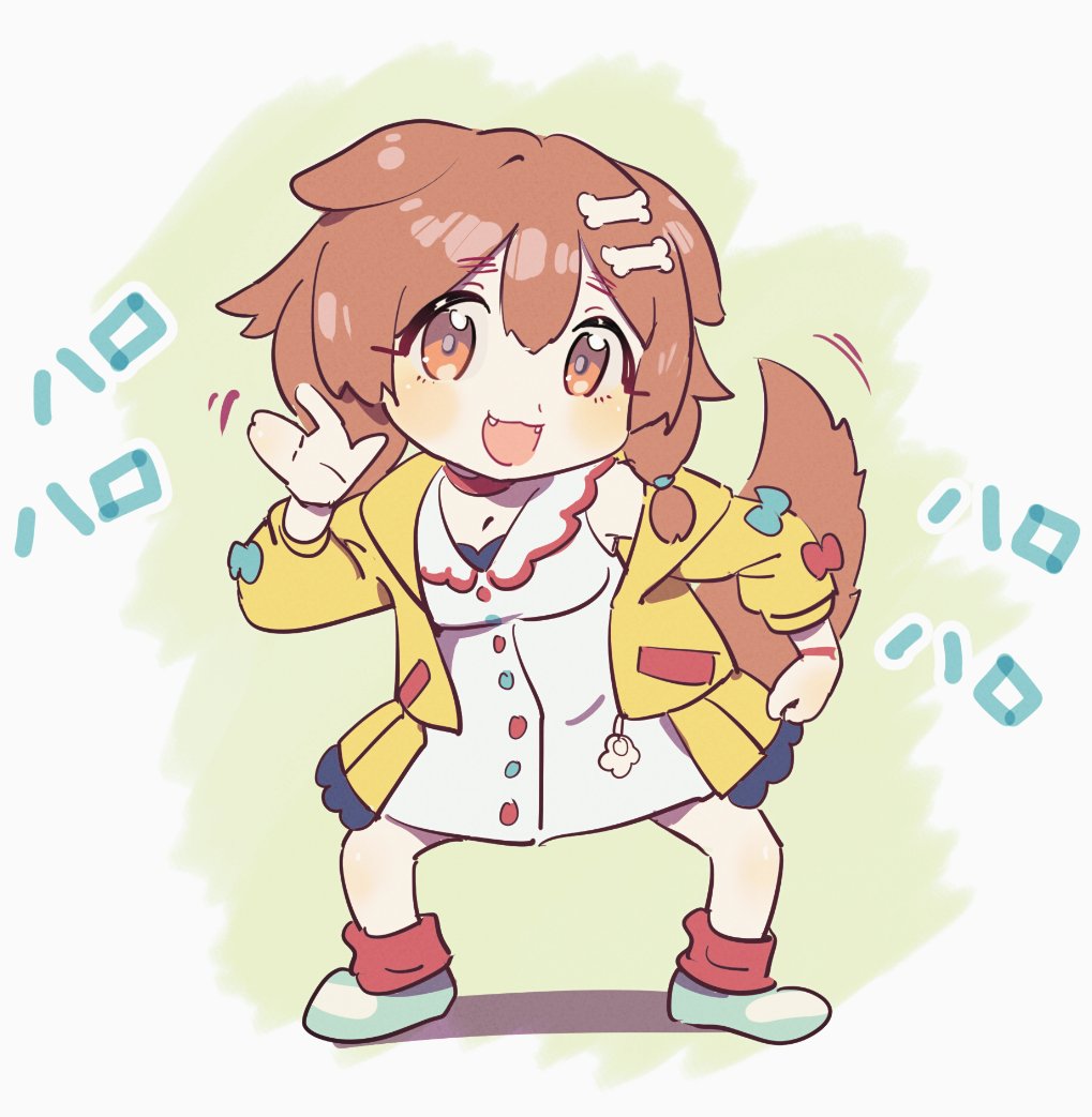 1girl animal_ears bone_hair_ornament breasts brown_eyes brown_hair chibi commentary_request dog_ears dog_girl dog_tail dress fangs hair_ornament hololive inugami_korone jacket medium_breasts sapysha solo tail virtual_youtuber white_dress wristband yellow_jacket