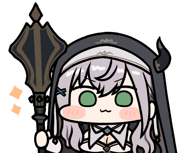 1girl :3 black_hat cow_horns flanged_mace green_eyes grey_hair habit hair_ornament hat holding holding_mace holding_weapon hololive horns jazz_jack looking_at_viewer mace nun nun_headdress official_alternate_costume polearm shirogane_noel shirogane_noel_(battle_nun) shirogane_noel_(nun) smile solo transparent_background virtual_youtuber weapon x_hair_ornament