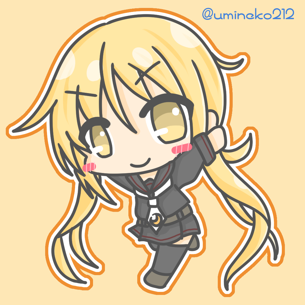 >:) 1girl belt black_sailor_collar black_serafuku black_shirt black_skirt black_thighhighs blonde_hair blush_stickers brown_background brown_belt brown_eyes brown_shoes chibi closed_mouth commentary_request crescent full_body hair_between_eyes kantai_collection long_hair looking_at_viewer low_twintails neckerchief one-hour_drawing_challenge orange_outline outline pleated_skirt sailor_collar satsuki_(kancolle) school_uniform serafuku shirt shoes simple_background skirt smile solo thighhighs twintails twitter_username umineko212 v-shaped_eyebrows very_long_hair white_neckerchief white_outline