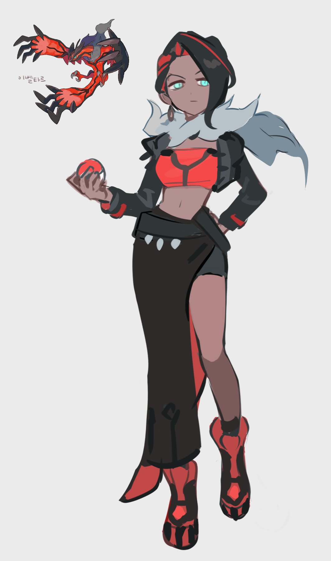 1girl black_boots black_hair black_shorts black_skirt blue_eyes boots closed_mouth colored_inner_hair curtained_hair dark-skinned_female dark_skin earrings full_body fur_scarf gen_6_pokemon grey_background half-closed_eyes half-skirt hand_on_own_hip highres holding holding_poke_ball jewelry juliet_sleeves kuzuvine legendary_pokemon long_skirt long_sleeves looking_to_the_side midriff multicolored_boots multicolored_hair navel nintendo official_art_inset personification poke_ball pokemon puffy_sleeves red_boots red_hair red_skirt red_tube_top short_hair short_shorts shorts simple_background single_earring sketch skirt solo strapless streaked_hair tube_top two-sided_fabric two-sided_skirt two-tone_boots two-tone_hair yveltal
