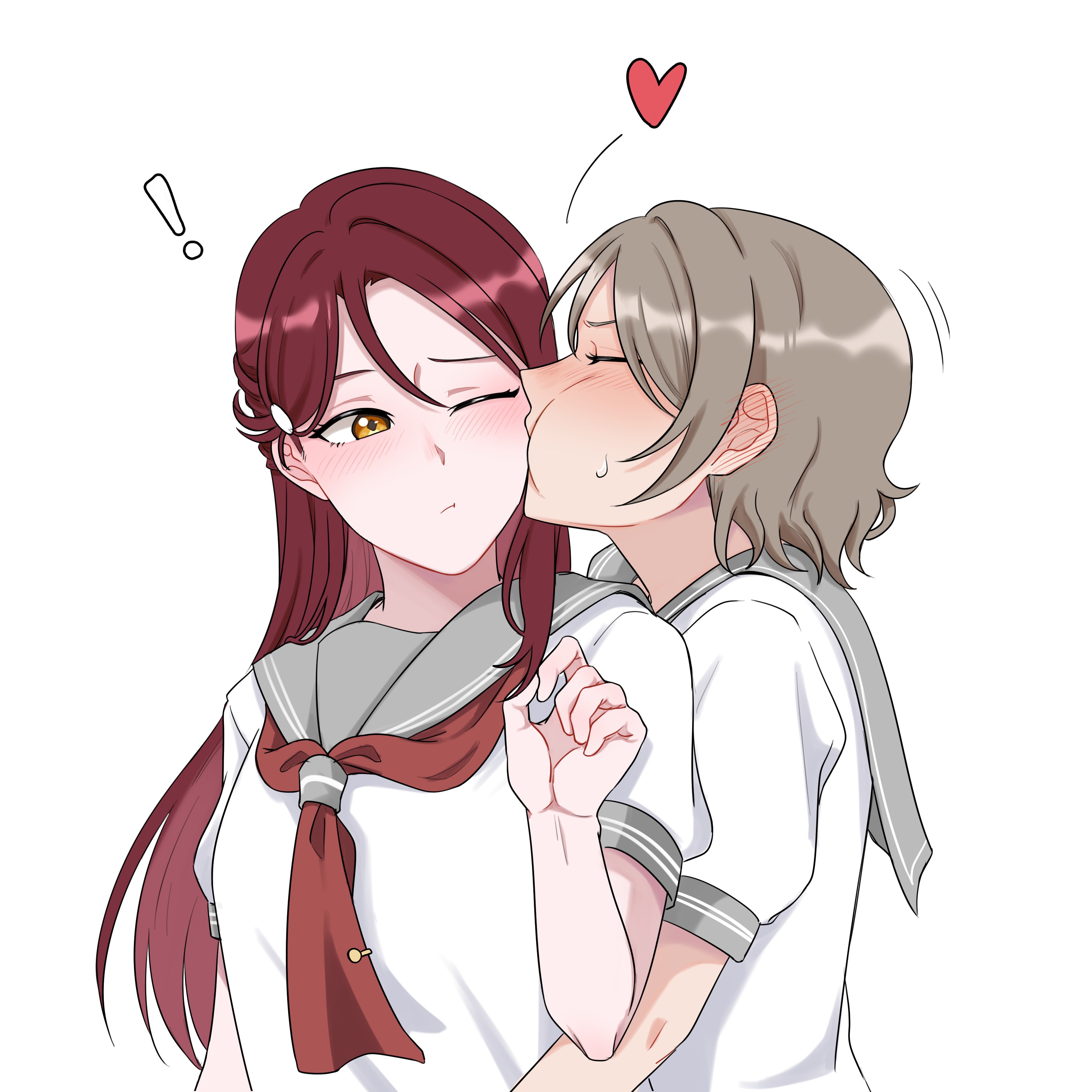 ! 2girls absurdres blush brown_eyes brown_hair heart highres jorpxn kiss kiss_day long_hair looking_at_another love_live! love_live!_sunshine!! multiple_girls one_eye_closed red_hair sakurauchi_riko school_uniform short_hair simple_background watanabe_you white_background yuri