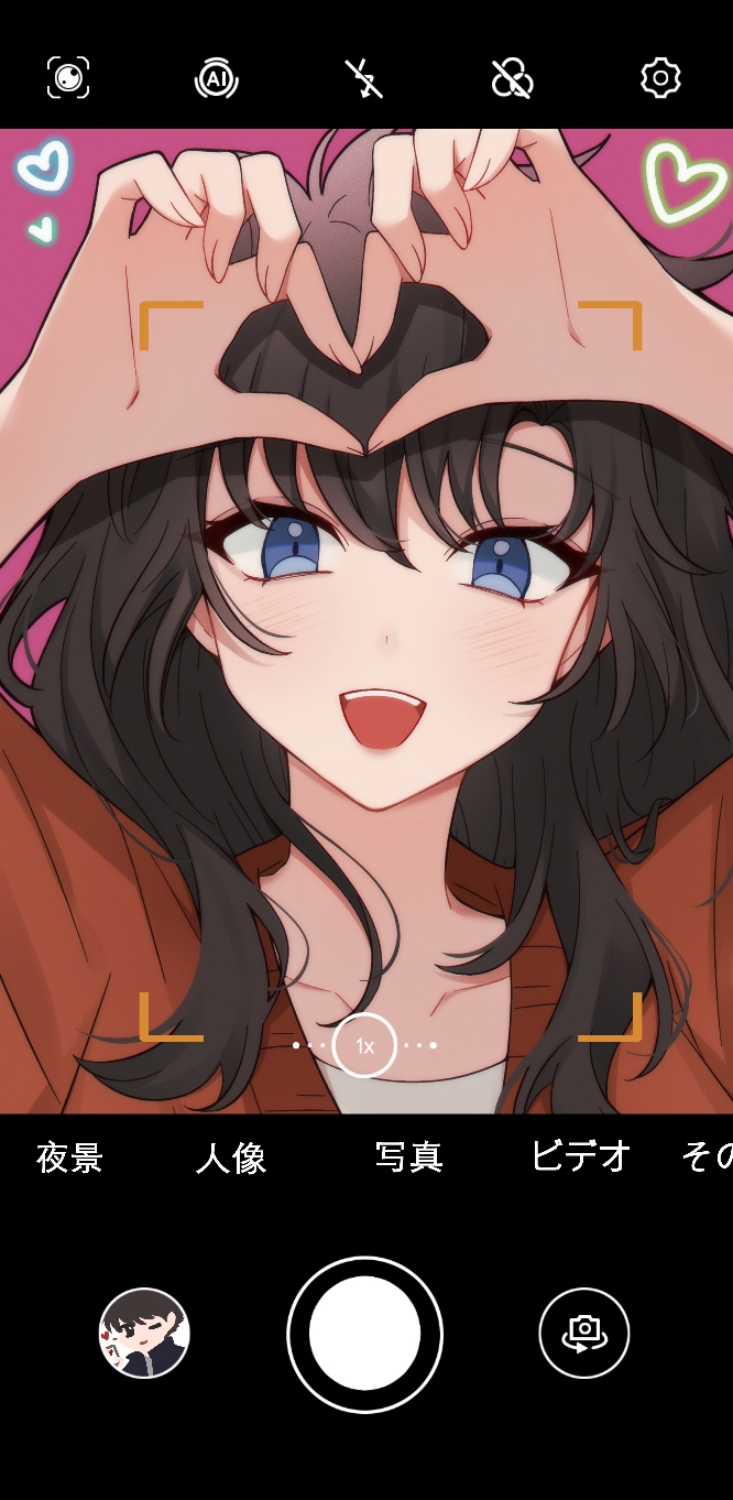1boy 1girl akimoto_rie arms_up blue_eyes brown_hair commentary_request heart heart_hands highres kuroba_kaito light_blush long_hair looking_at_viewer magic_kaito meitantei_conan nakamori_aoko open_mouth orange_sweater shirt solo solo_focus sweater teeth translation_request upper_teeth_only viewfinder white_shirt