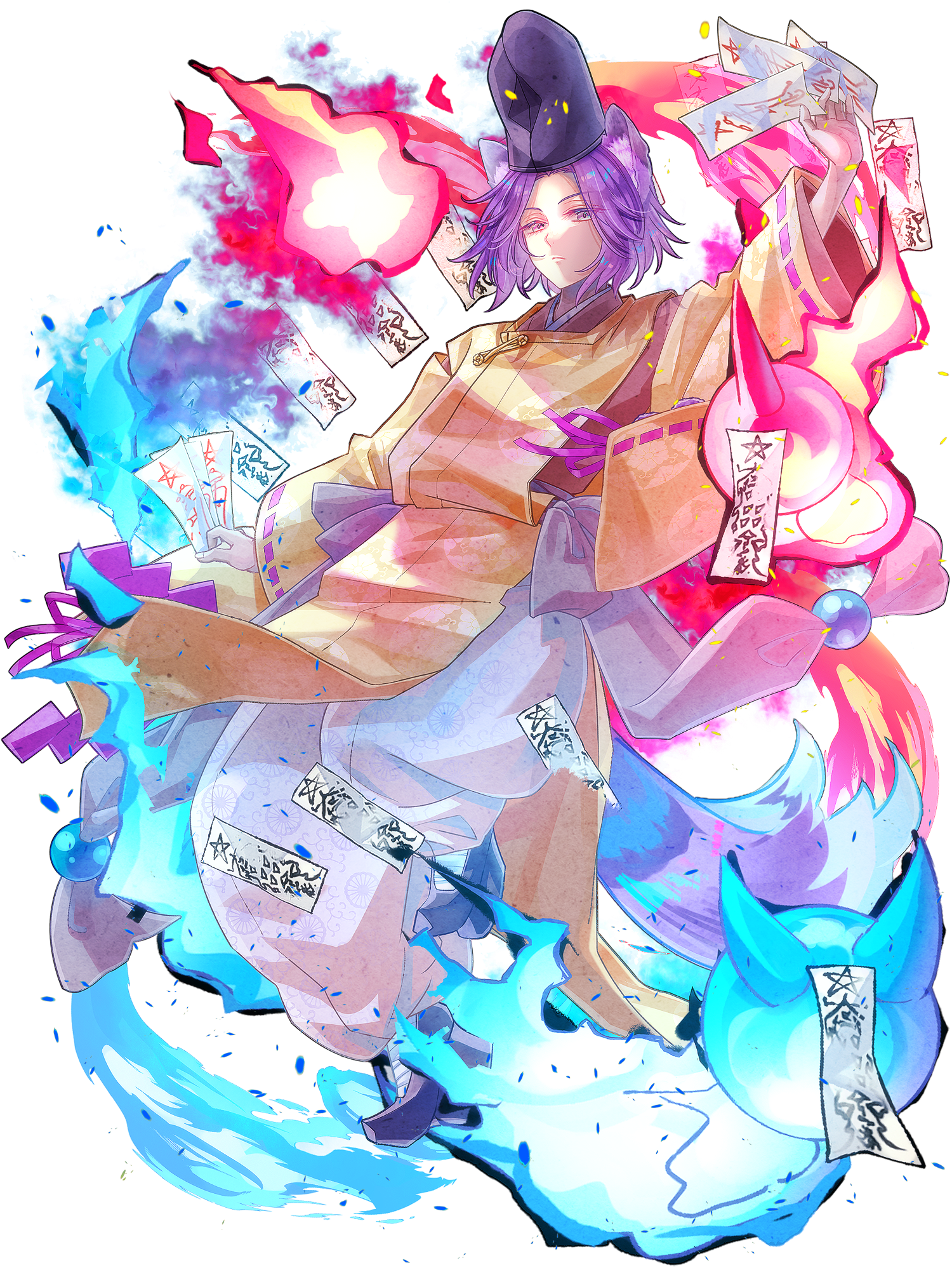 1girl animal_ears black_footwear blue_fire dairoku_ryouhei fire full_body hat highres japanese_clothes purple_eyes purple_hair rai-gg ribbon-trimmed_sleeves ribbon_trim short_hair standing tail talisman tate_eboshi vivi_yuzuriha wide_sleeves