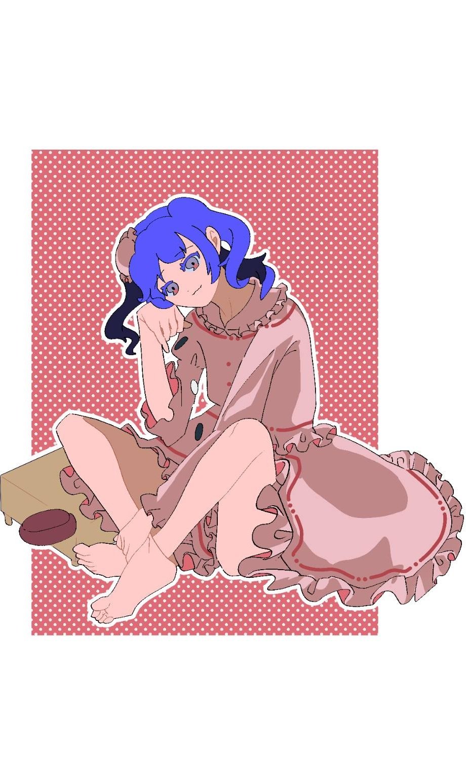 1girl bare_legs barefoot blouse blue_hair board_game border bowl closed_mouth frilled_shirt frilled_shirt_collar frilled_skirt frills go_(board_game) hat head_tilt highres medium_hair mini_hat pink_background pink_hat pink_shirt pink_skirt polka_dot polka_dot_background portrait_of_exotic_girls purple-haired_oekaki_girl_(touhou) purple_eyes shirt shizuku_hky simple_background skirt smile soles solo toes touhou white_border