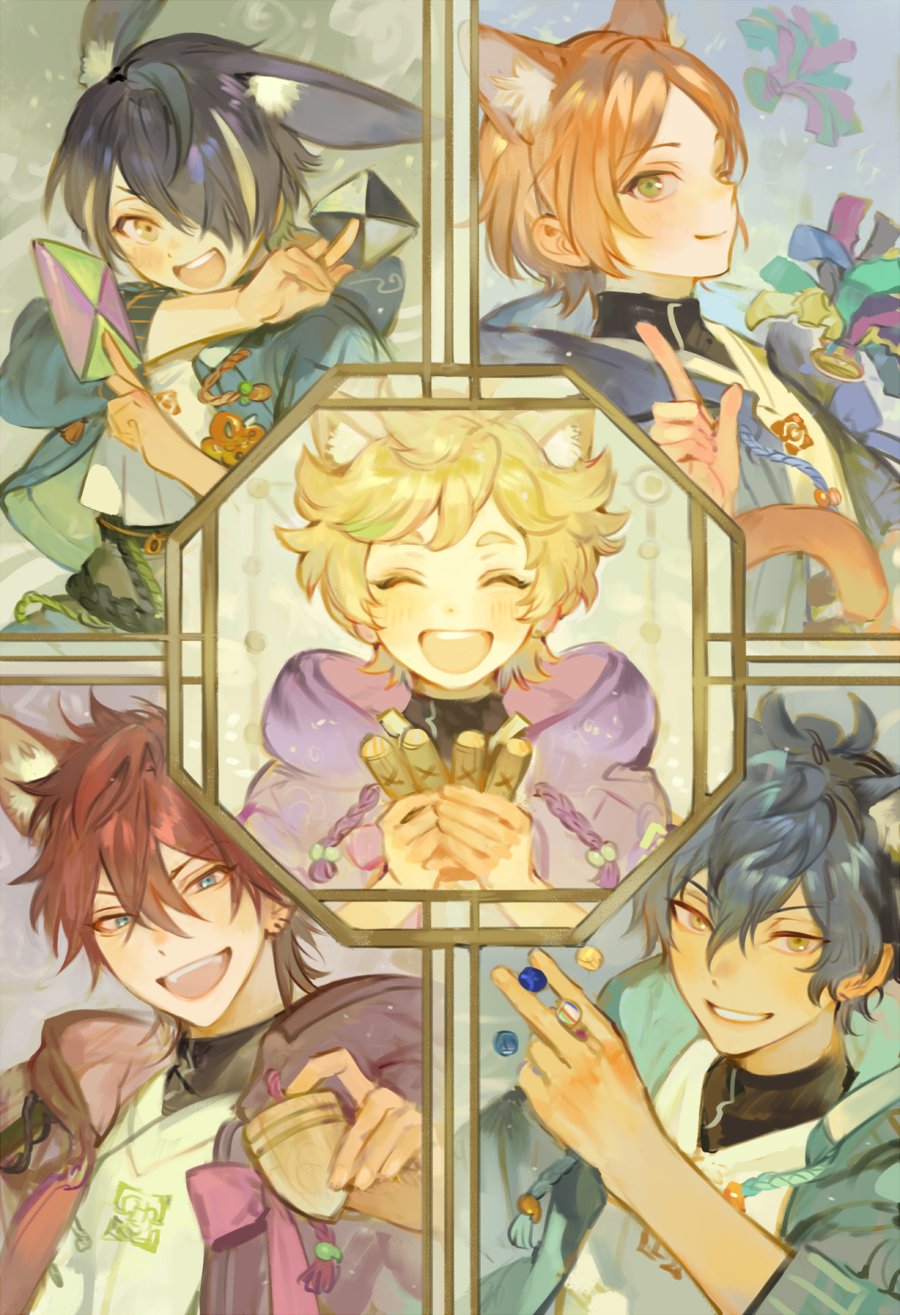 5boys amagi_rinne animal_ears aoi_yuta border collage ensemble_stars! extra_ears harukawa_sora highres kemonomimi_mode kuzuvine male_focus multiple_boys ornate_border portrait sazanami_jun sengoku_shinobu