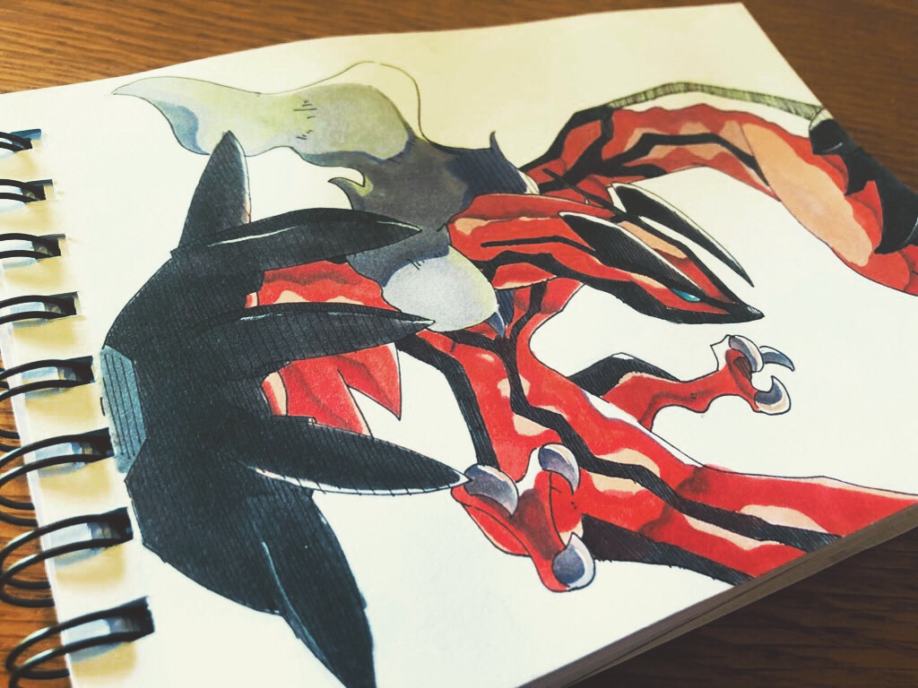 animal_focus blue_eyes claws gen_6_pokemon legendary_pokemon looking_afar napopo nintendo no_humans painting_(medium) photo_(medium) pokemon pokemon_(creature) simple_background solo traditional_media watercolor_(medium) white_background yveltal