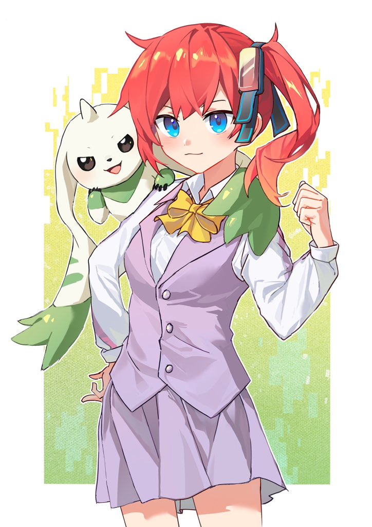 aiba_ami blue_eyes digimon digimon_story:_cyber_sleuth goggles goggles_on_head long_hair red_hair school_uniform sidetail terriermon