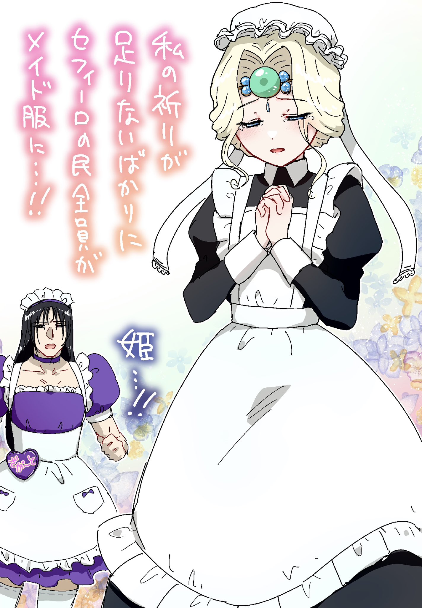 1boy 1girl alternate_costume apron black_dress black_hair blonde_hair closed_eyes commentary_request crossdressing dress emeraude_(rayearth) enmaided hat highres itou_katsumi long_hair magic_knight_rayearth maid maid_headdress mob_cap purple_dress short_hair solo_focus translation_request white_apron zagato_(rayearth)