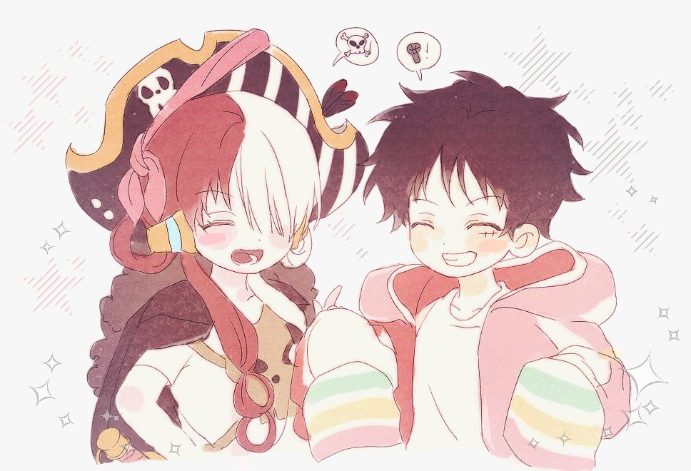 1boy 1girl ^_^ aged_down blush child closed_eyes commentary_request hair_over_one_eye hat headphones jacket korean_commentary monkey_d._luffy n_o1n2 one_piece open_mouth pink_jacket pirate_hat red_hair scar scar_on_face smile twintails upper_body uta_(one_piece) very_long_sleeves white_hair