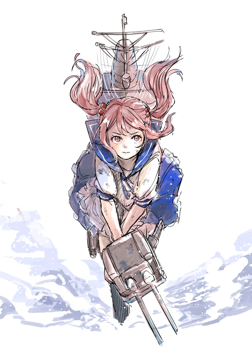 1girl adapted_turret apron blue_neckerchief blue_sailor_collar blue_skirt cannon commentary_request frilled_apron frills hair_bobbles hair_ornament highres kantai_collection leaning_forward looking_at_viewer medium_hair neckerchief pink_eyes pink_hair pleated_skirt rigging sailor_collar sazanami_(kancolle) sazanami_kai_(kancolle) school_uniform serafuku ship_turret skirt solo uzaki_(jiro) waist_apron