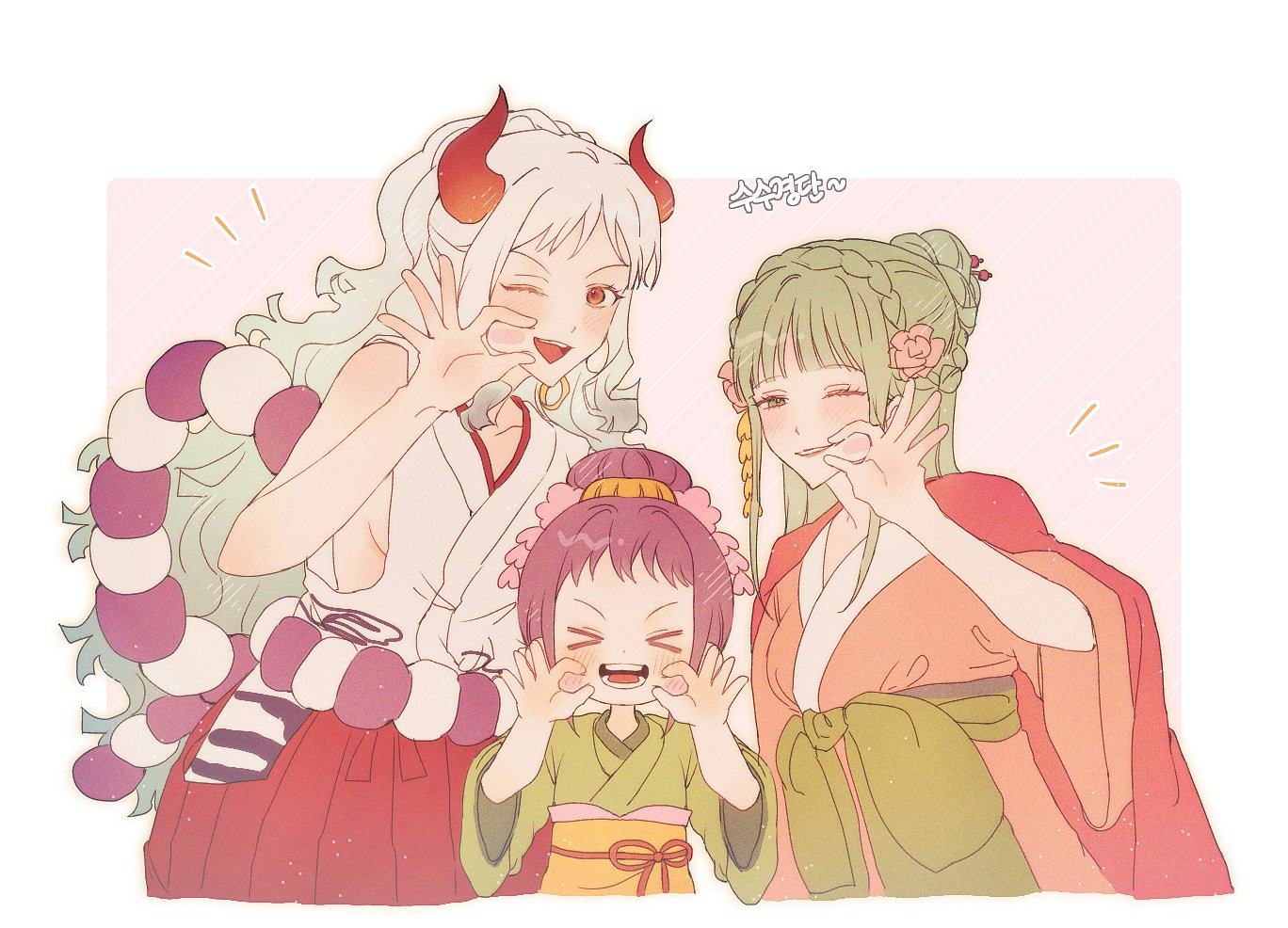 >_< 3girls cheek_poking child commentary_request earrings green_hair green_kimono green_sash hair_bun hakama half_updo horns japanese_clothes jewelry kimono korean_commentary kouzuki_hiyori kurozumi_tama looking_at_viewer multicolored_hair multiple_girls n_o1n2 notice_lines one_eye_closed one_piece open_mouth pink_kimono poking ponytail red_hakama red_horns sash sidelocks sleeveless sleeveless_kimono smile two-tone_hair white_hair white_kimono yamato_(one_piece) yellow_sash