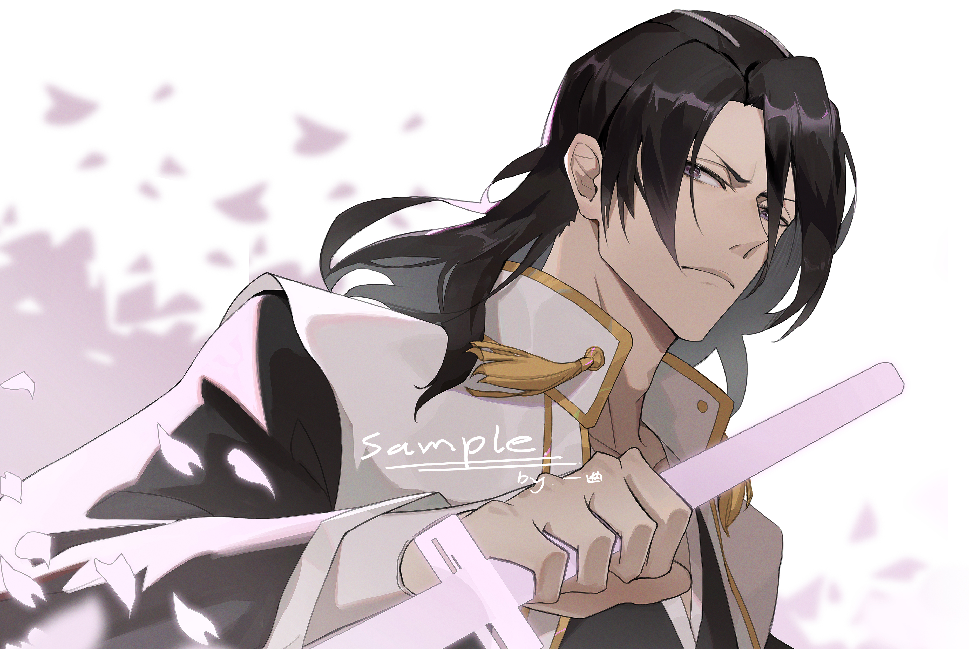 1boy absurdres black_hair bleach bleach:_sennen_kessen-hen cherry_blossoms chinese_commentary closed_mouth collarbone hair_between_eyes hair_ornament haori highres holding holding_sword holding_weapon japanese_clothes kuchiki_byakuya long_hair looking_at_viewer male_focus purple_eyes reverse_grip senbonzakura_(shikai) shihakusho solo sword taichou_haori tassel upper_body weapon white_background yiqing_(yohare)