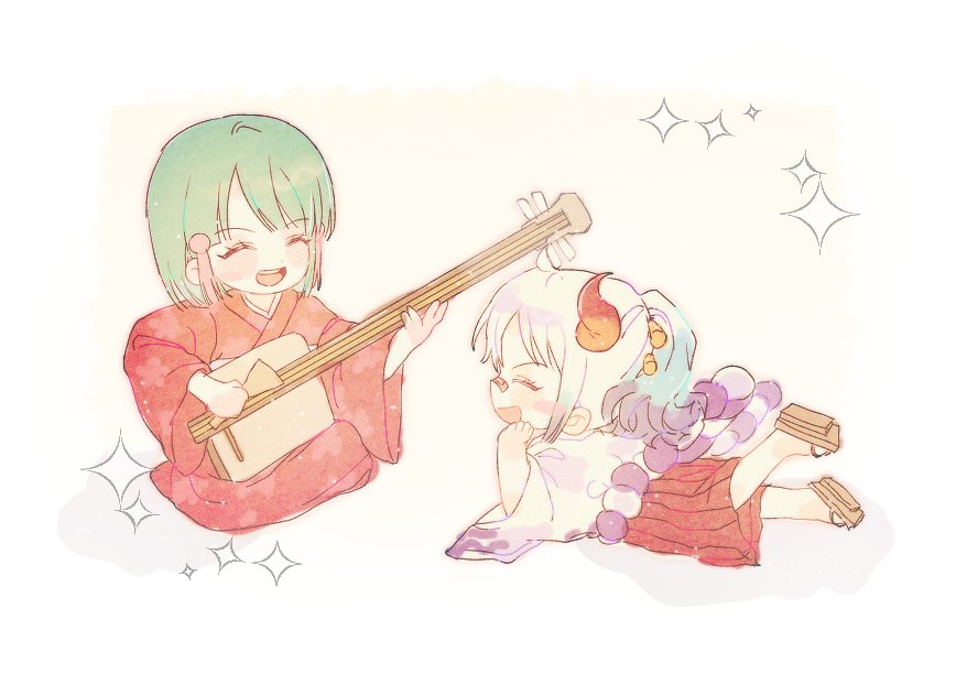 2girls ^_^ aged_down bandaid bandaid_on_face bandaid_on_nose blush_stickers child closed_eyes commentary_request geta green_hair hair_ornament hakama holding holding_instrument horns instrument japanese_clothes kimono korean_commentary kouzuki_hiyori multicolored_hair multiple_girls n_o1n2 one_piece ponytail profile red_hakama red_kimono rope shimenawa short_hair sparkle white_hair white_kimono yamato_(one_piece)
